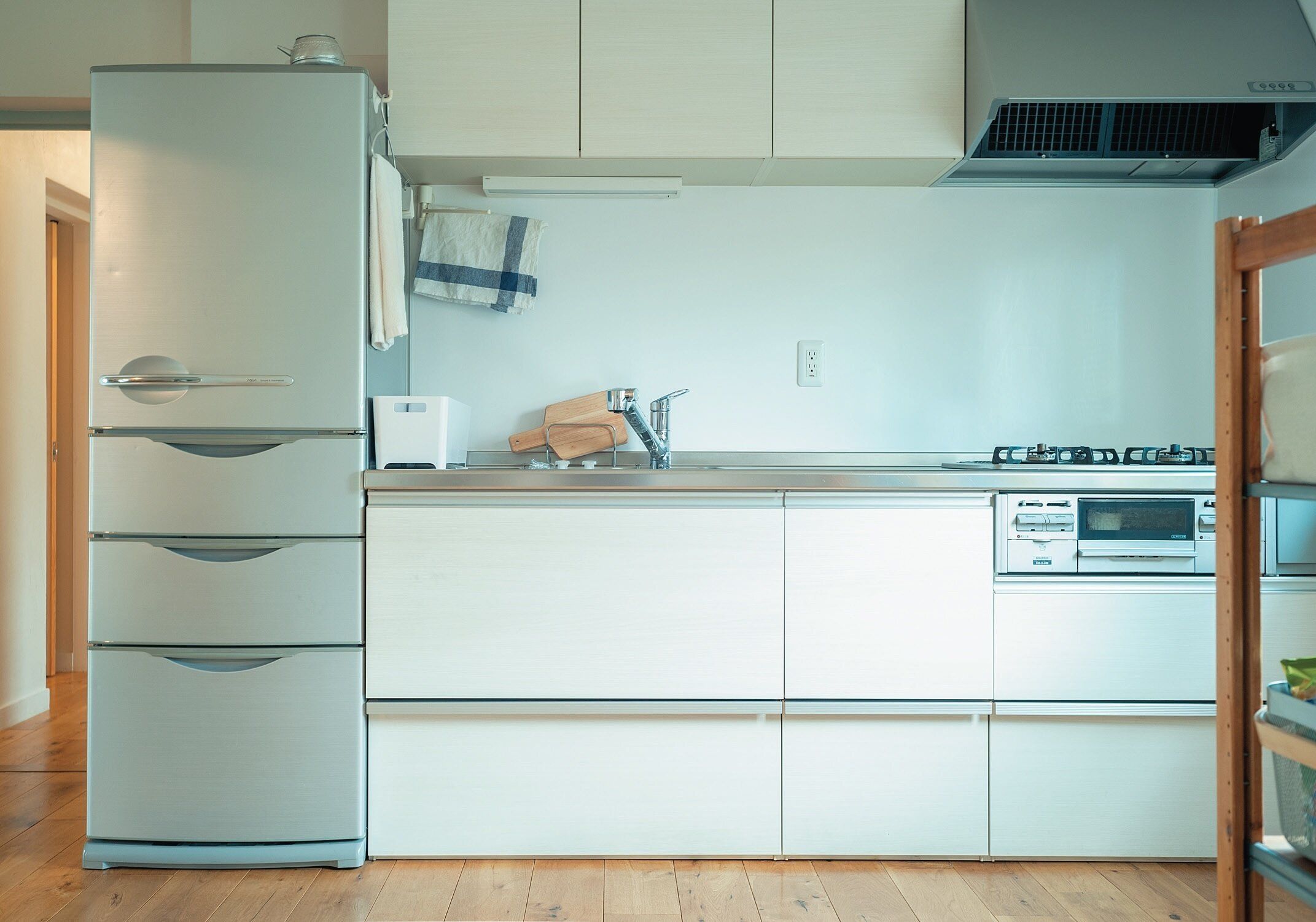 パッと見は何もない美しい収納。でもshoさんはミニマリストではなく、つり戸棚や各引き出しの中は意外にざっくり。「目につく場所に物を置くのをやめるだけで、スッキリ度が格段に上がります」。