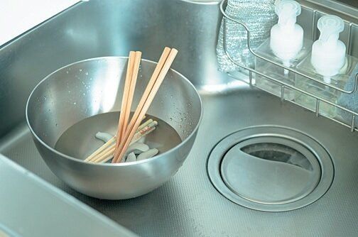 独身時代から使っている柳宗理のボウルはシンク内が定位置。「ボウルは水おけ代わり。使用後のお箸や箸置きなどを漬けて汚れを落としやすくします。シンクと同素材だからスッキリ見えます」。