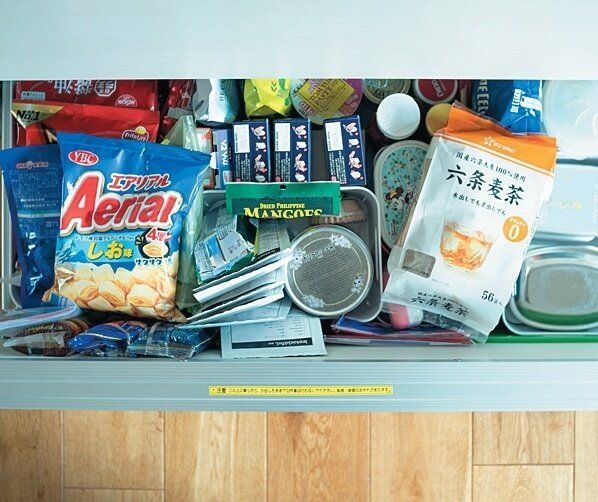 引き出し内の食材は「上から見たときにどこに何があるのかわかればよし」だとか。「この引き出しを開けるのはほぼ私だけだから、私がわかればOK。ただし入る分しか買わない、が鉄則です」。