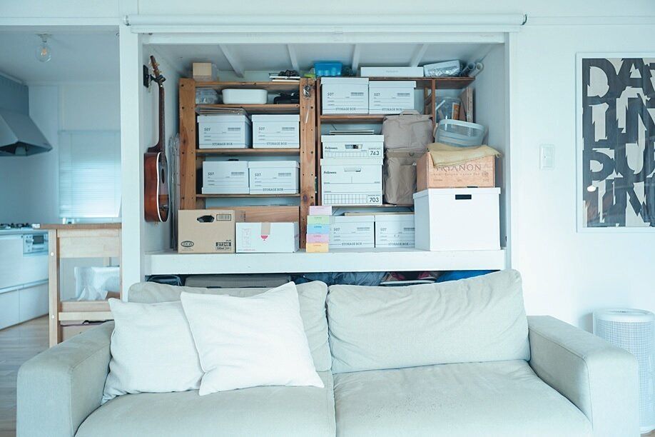 「壁のように見えるソファの背面ですが、実はロールカーテン。宅配便で届いたストック用の水や、メルカリへの出品待ちの物などを一時的に置くのに便利です」。閉めれば中が雑然としていてもまったく気になりません。