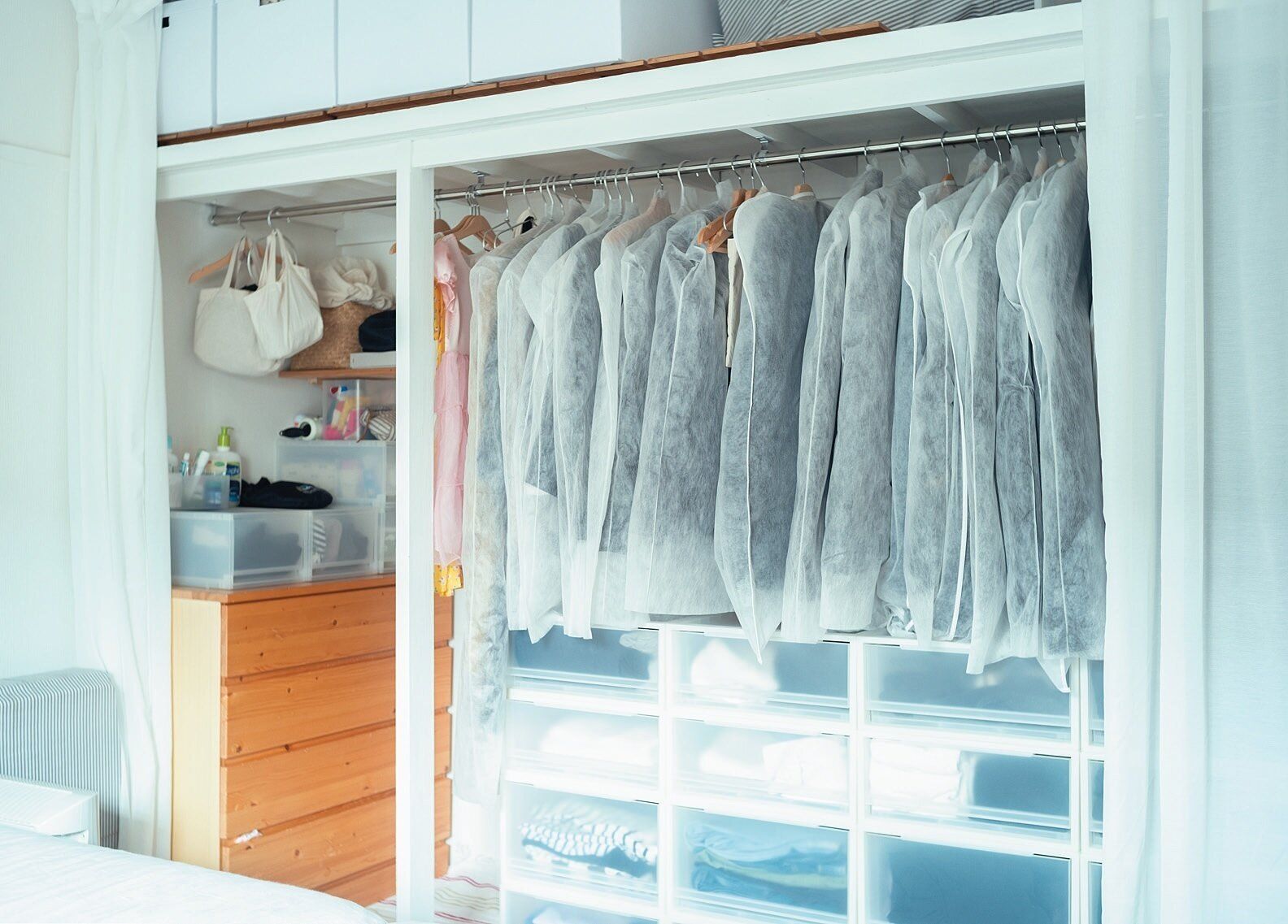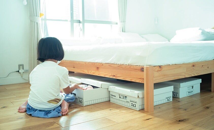 二女が1人で着替えられるように、寝室のベッドの下を二女の洋服の収納場所に。収納はふたつきで軽い紙箱を選べば出し入れしやすく、中が適当でも見えないからOKです。