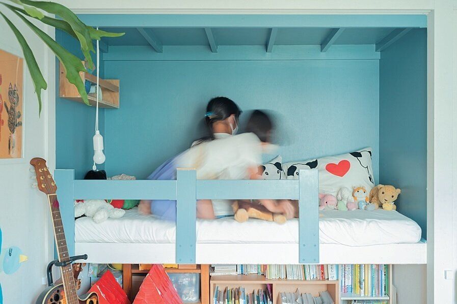 夫がDIYで押し入れを改造して子どもスペースに。「秘密基地のようなこの場所で、姉妹仲よく遊んでいます。ここは子どもたちが自由にしていい場所だから、とんでもなく散らかしても何も言いません」。