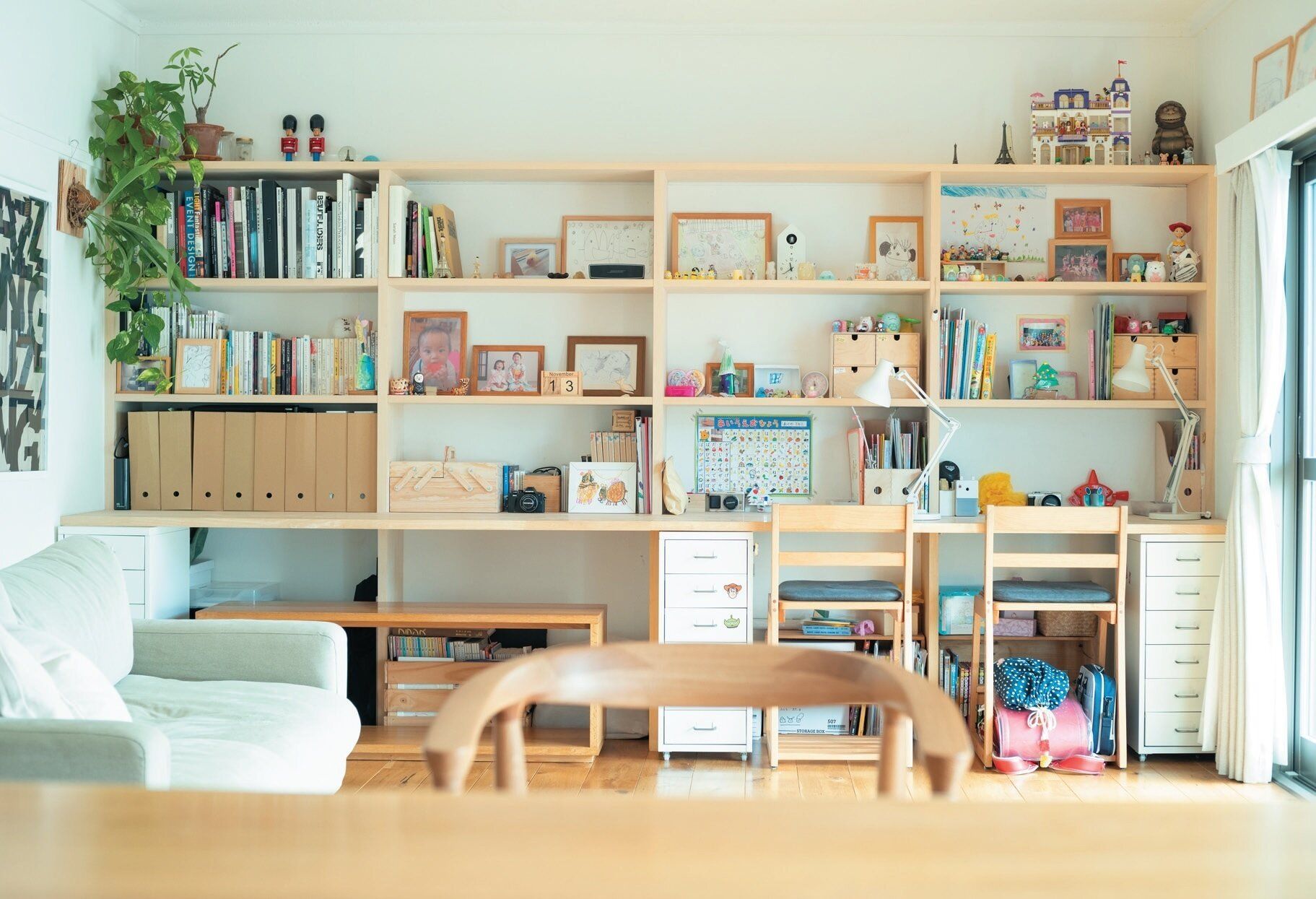 shoさんは元々、全部片づけないと気がすまない性格。でも娘たちが小さかった頃は長女が動き回るし、二女はずっと抱っこで、日中片づける時間がなかったとか。「片づけは姉妹が寝てから。片づけたいのに片づかない家に常にイライラしていました」。
