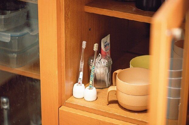 洗面所で歯みがきしないから歯ブラシは台所に。
