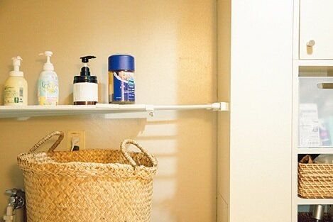 「水まわりが汚れるのが何より苦手」なMさん。「掃除がラク」を優先するため、シャンプーなどは洗面所に置き場所をつくりました。入浴後、子どもが体を拭いている間にサッと浴室を掃除→使い終えたタオルで拭く→除湿機をかける、のが習慣。ティッシュの入れ替えも地味に面倒だから、キッチンにひとつだけ。