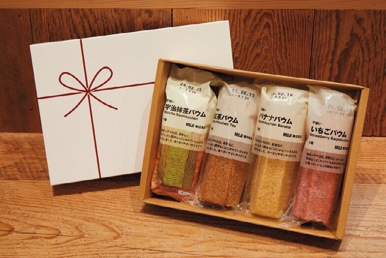 「色とりどりのバウムのほか、スコーンやケーキなど不揃いシリーズのスティック焼き菓子が対象。専用ボックスに詰めてギフトにできます。コーヒーとセットにしても箱にジャストフィット。お茶の時間が楽しくなるギフトに!」(澁谷さん)。