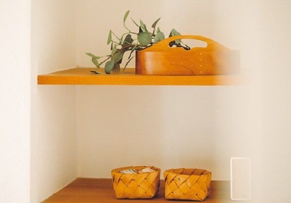 薄い木材を曲げたシェーカーボックスは、北欧インテリアの人気アイテム。「使っていないスマホケースなどの一時保管として活用しています。手軽に収納でき、そのまま置きっ放しでもおしゃれ!」。