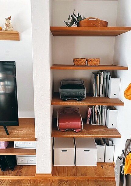 中段は、子ども2人のランドセル&教科書置き場に。玄関から一番近い場所だから、帰宅したらすぐここにランドセルを戻すという習慣が無理なく続けられます。