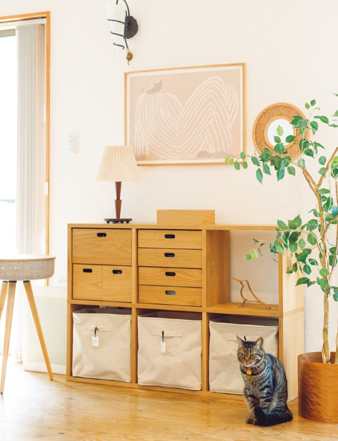 リビングのオープン棚をすべて収納に使うと圧迫感が出るので、両サイドの棚の上2段には“見せる”箱やかごだけに。余白があることで、雑貨がより引き立ちます。