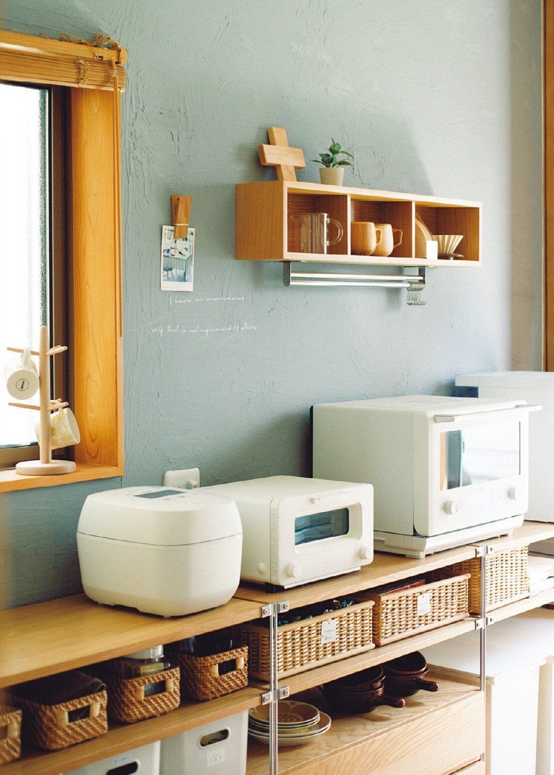 「以前使っていた背が高い食器棚を知人に譲り、無印良品のキャビネットをカウンター収納として使っています」。家電は白、収納は白と天然素材でそろえることで、よりスッキリしたスペースに。
