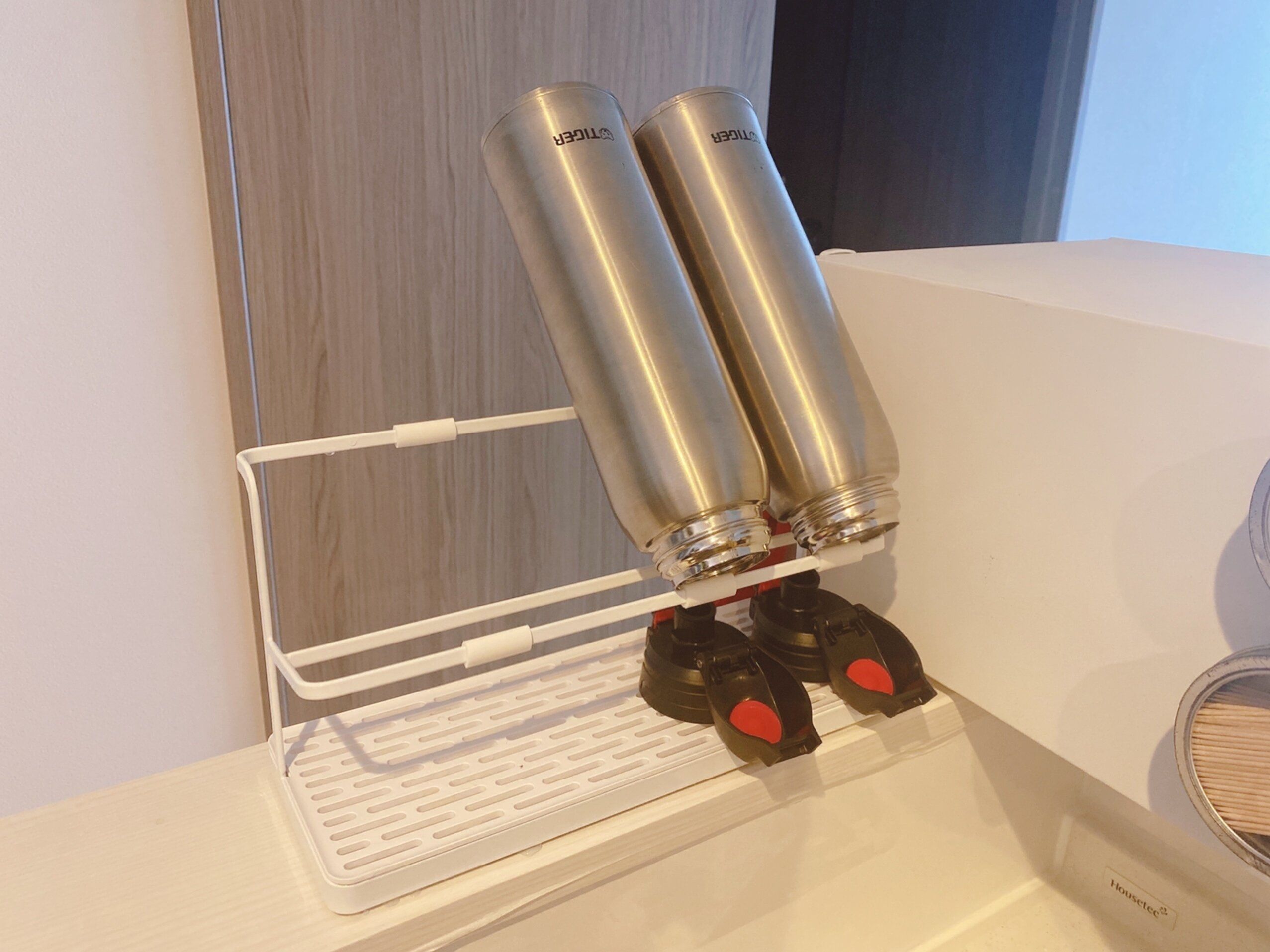 大きな水筒でも2個余裕で置くことができます。上段にはボトルを、下段にはフタやパッキンなどの小物類と分けて置けるため、翌朝には水筒をスムーズに用意でき、効率的に水切りができる専用スタンドです。