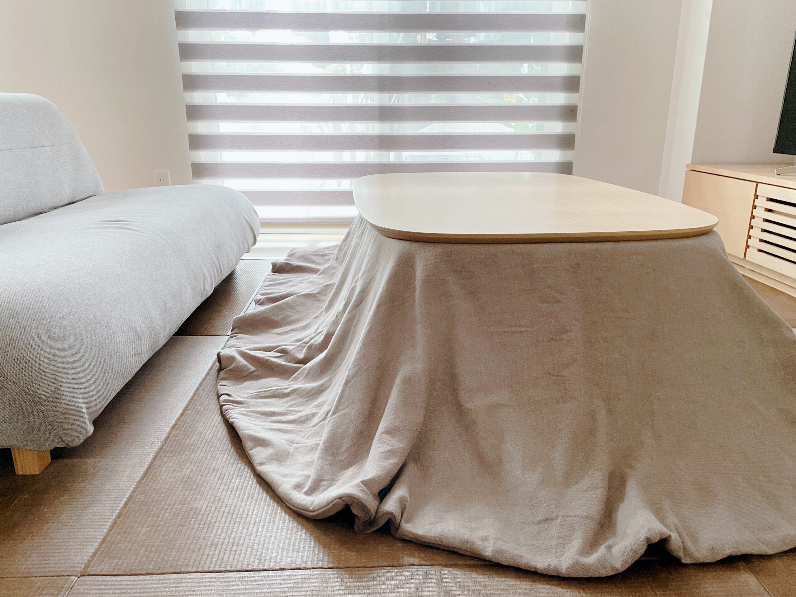 床暖房を取り入れてよかったと実感しているのは、足元が冷えるからという理由で、ラグや電気式カーペット、足元ヒーターなのを持つ必要がないからです。特に今年からこたつ生活を始めてみたら、その相性のよさを実感!ラグは要らず、床暖房をつけておけばこたつの電源をつける必要もなく、あったか生活を満喫できます。
