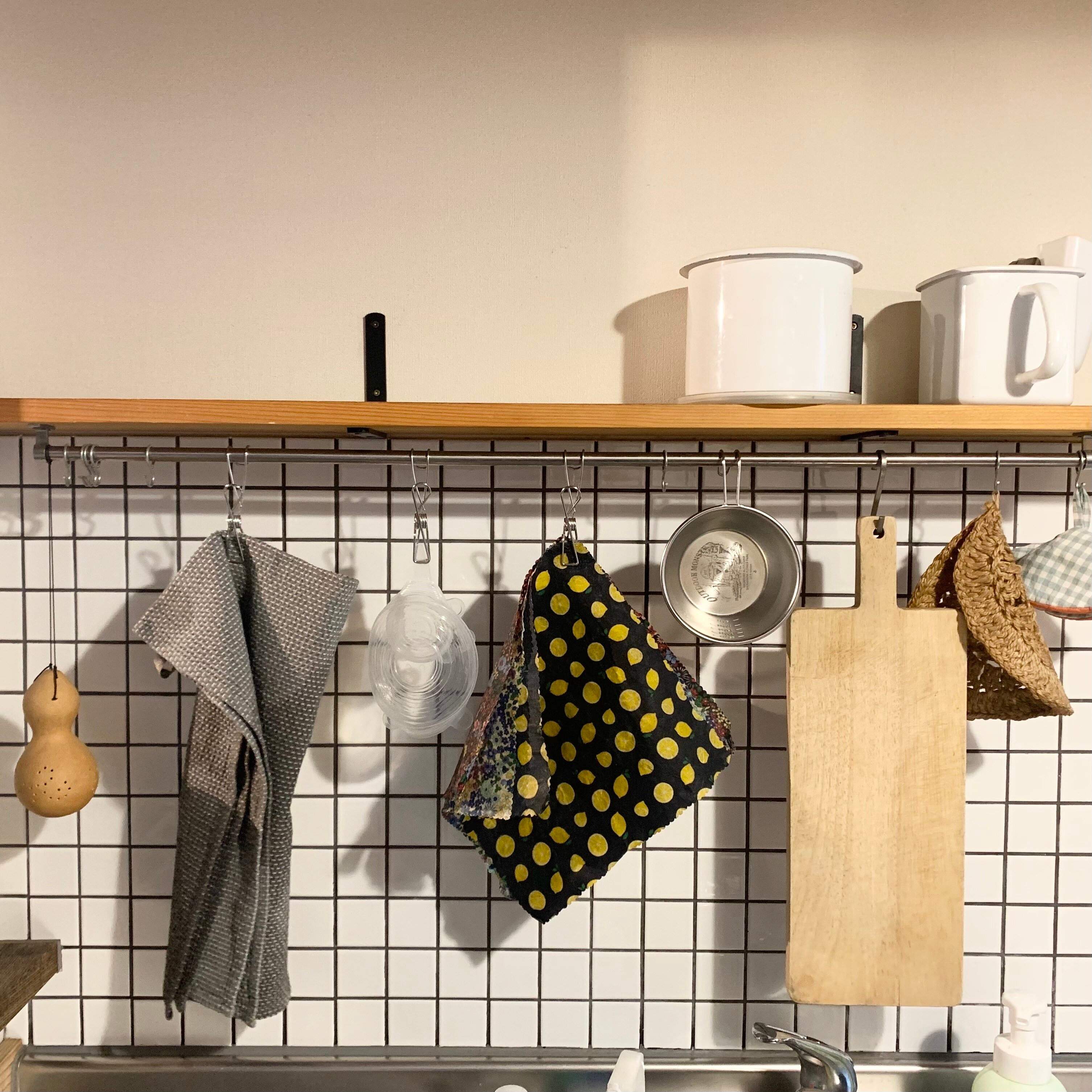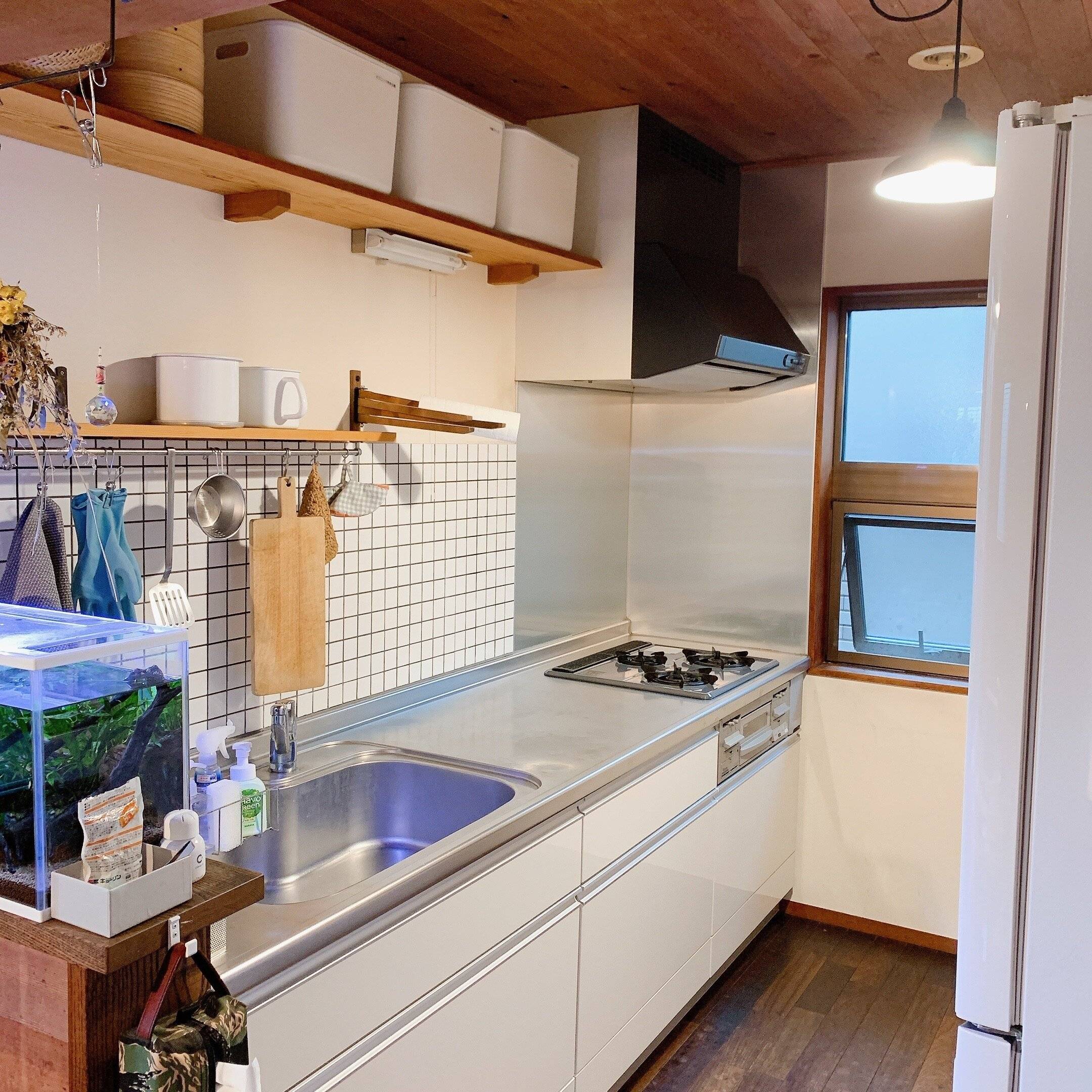 玄関やキッチンも壁面収納をうまく使って、空中収納を有効活用したら、部屋もスッキリして、掃除もしやすくなりました。