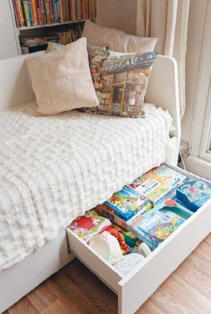 ベッド下の収納は、子どものおもちゃスペース。決められた収納スペースからはみ出したら、「使わない物は手放す!」のが大人も子どもも共通のルール。