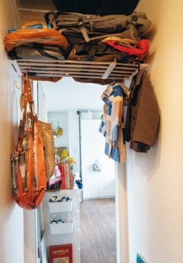 ちょっとした空間は日本で購入したつっぱり棒を上手に組み合わせて即席収納スペースに。この便利さは日本のグッズならでは!