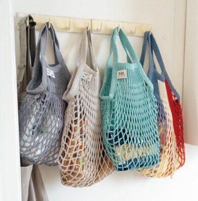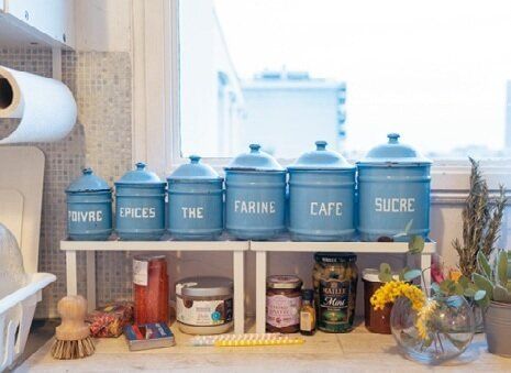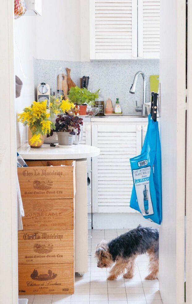 キッチンにあるワインの木箱は主に食料品やキッチン道具の収納に。壁にかけたカラフルなネットバッグは野菜などを入れて、見た目もキュートに。