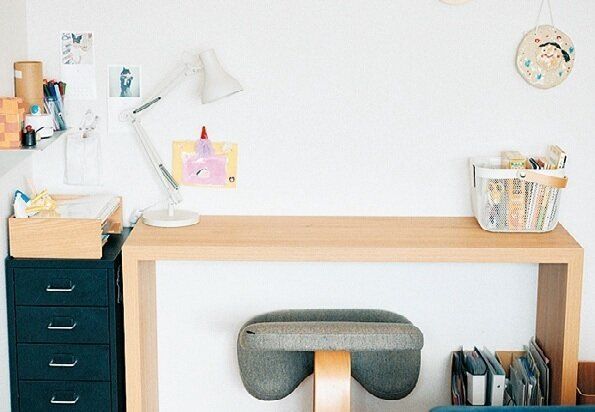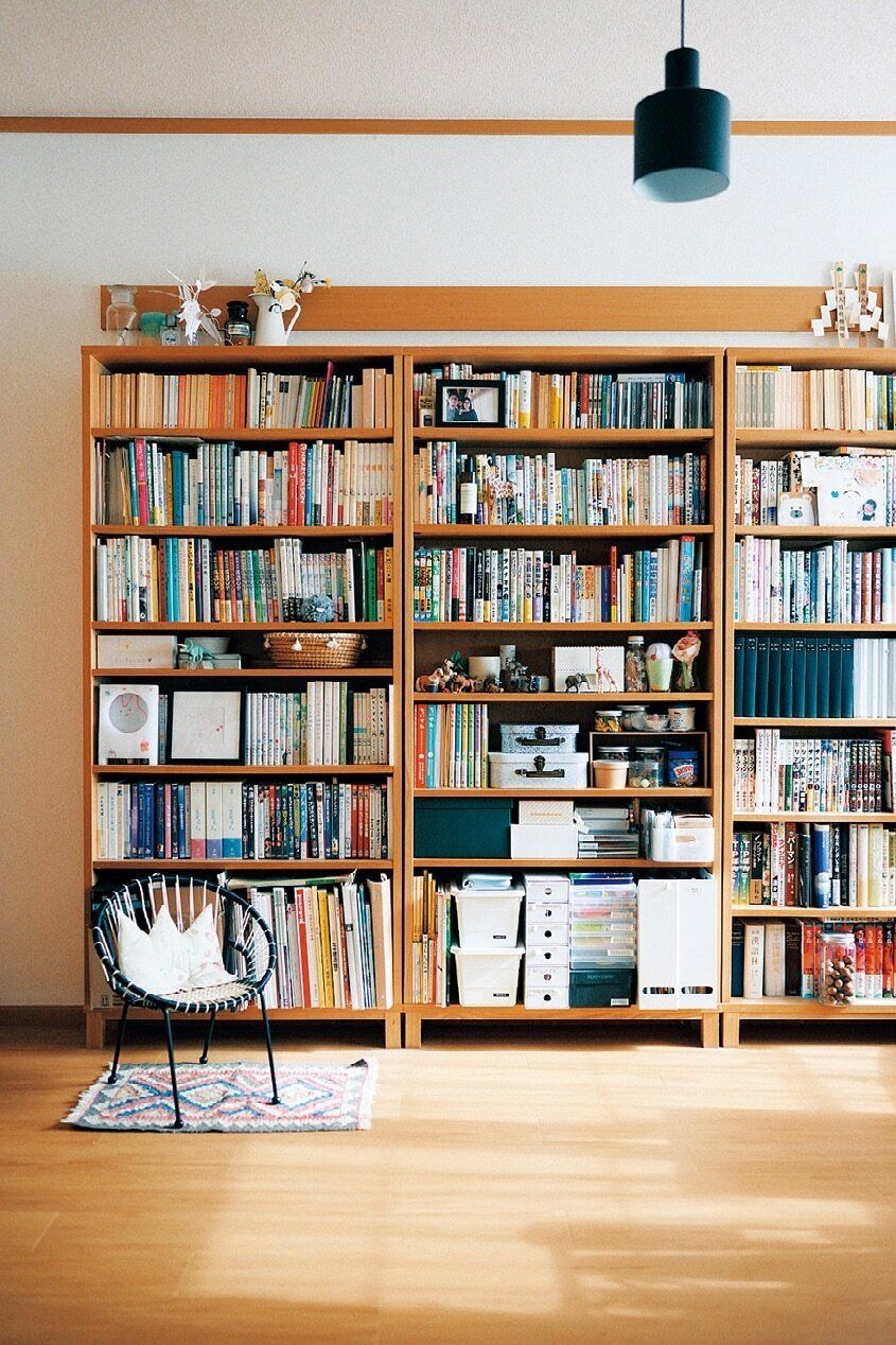 本棚も家族共用の机まわりも、ナチュラルカラーだけでまとめず、「黒」の箱や家具をちょい交ぜ。「黒を少し足すと、空間がぐっとカッコよくなるんです」。