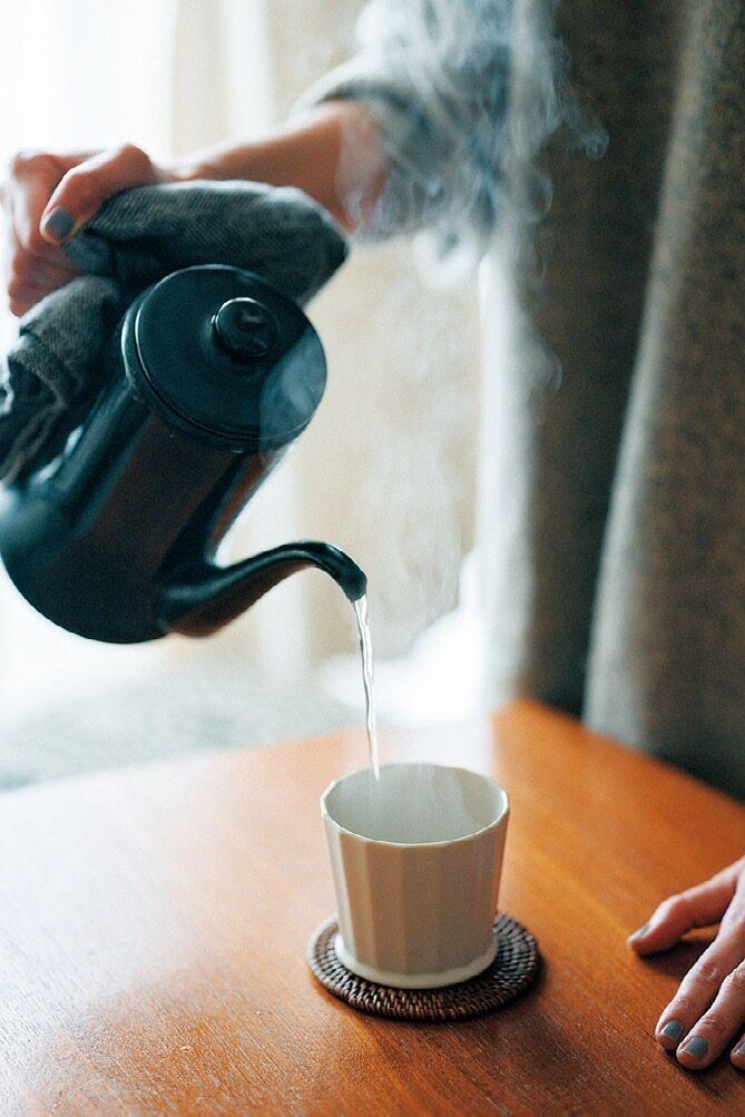 「朝、子どもを学校に送り出した後や晩酌の後(笑)は、大好きなカップで白湯を飲み、体を温めます」。シュンシュンとお湯が沸く音や、ほわ~っと立ち上る湯気にも癒されます。
