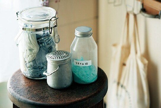 水色の粉は電子レンジで加熱してから砕いた「ウタマロ石けん」。昭和のこしょう入れには重曹。小さく切った古布で窓のさんや蛇口を清める。