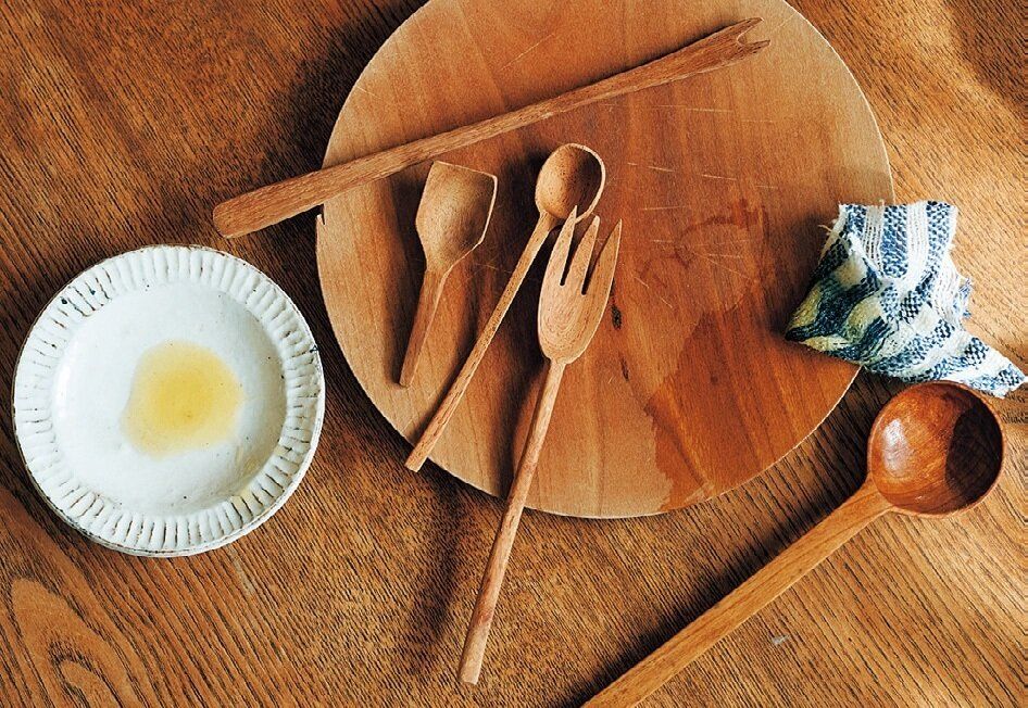 木製品にはオリーブオイルを塗り込むと汚れにくくなる。黒ずんできたら紙やすりで磨いて5年、10年と使い続ける。