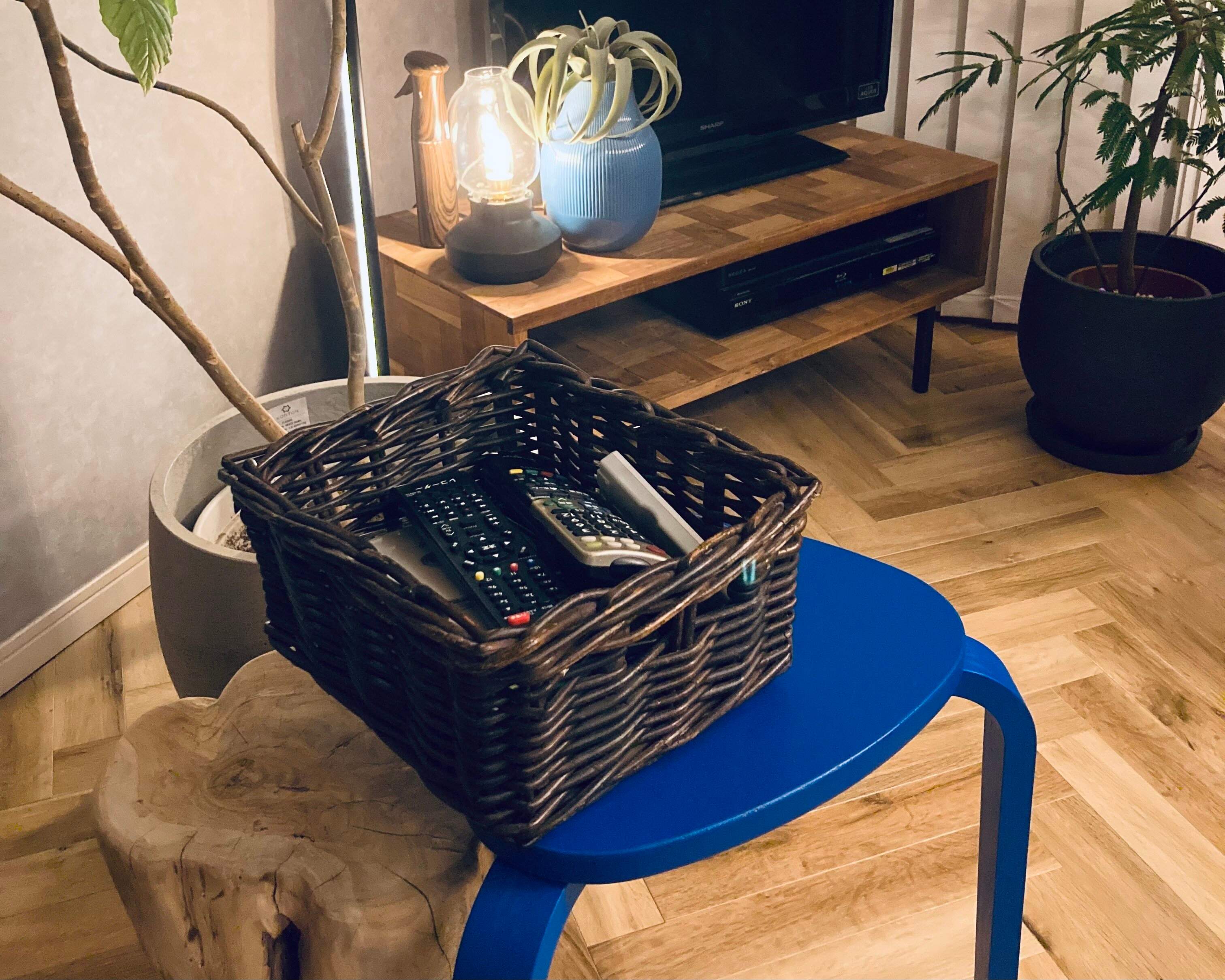 カゴのままTV下に置けば、リモコンを探す手間も省け、見た目もスッキリします。