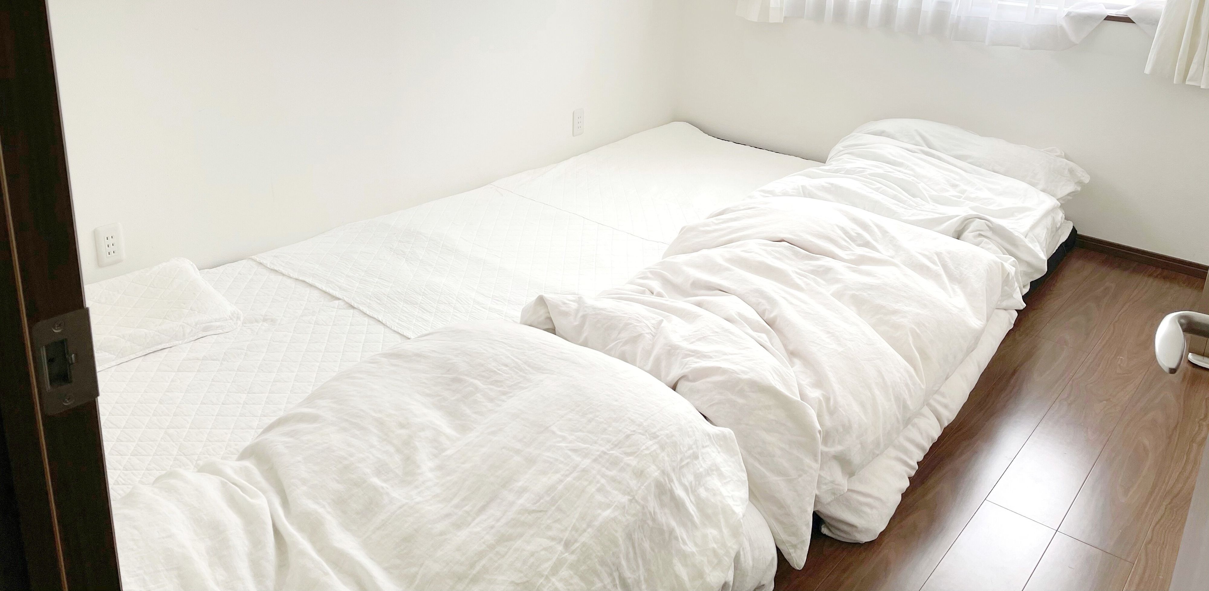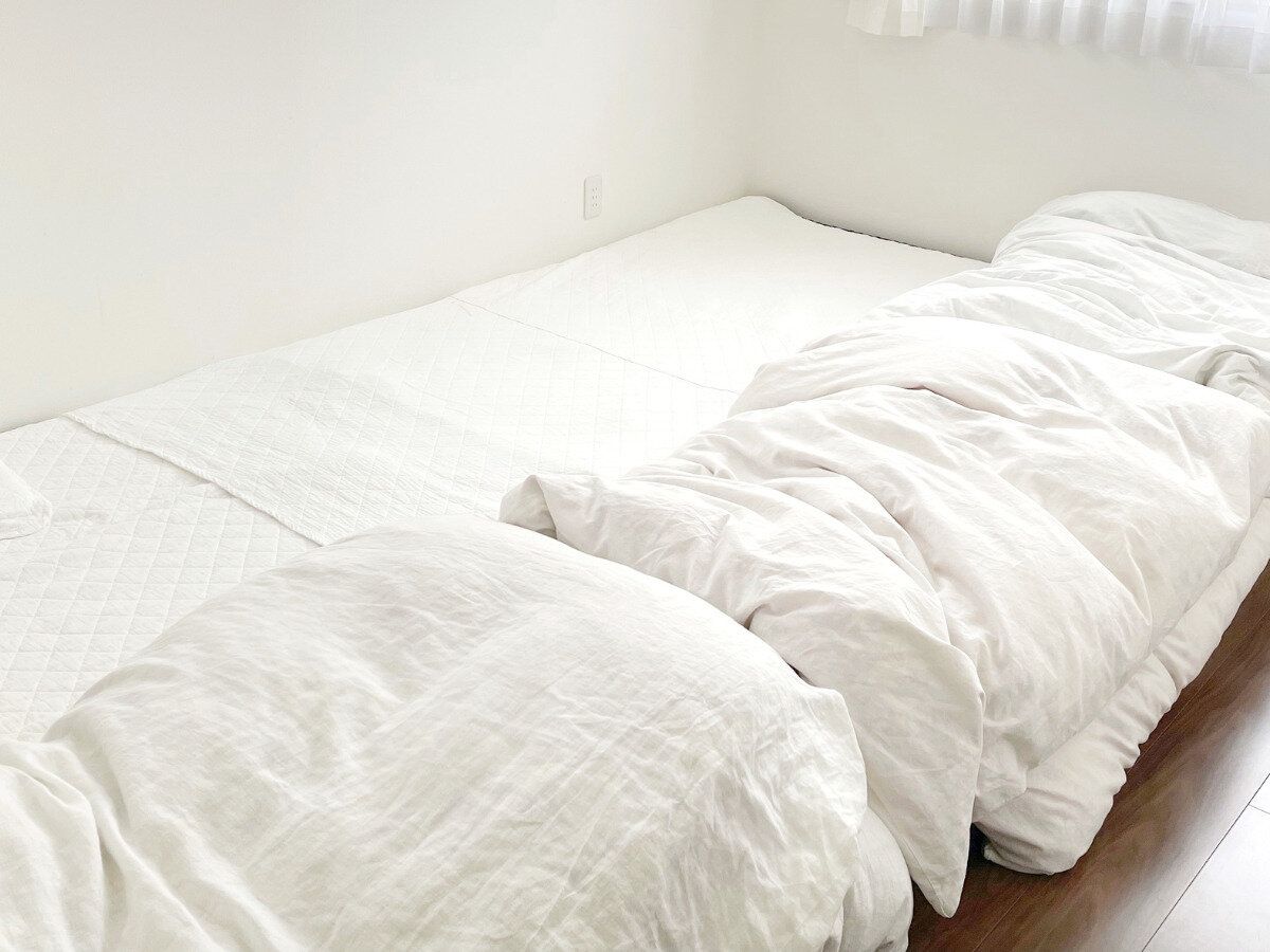 以前は、夫は青、私はピンクの敷きパッドに、花柄のカラフルな布団カバー、カーテンも柄模様と、統一感ゼロでした。