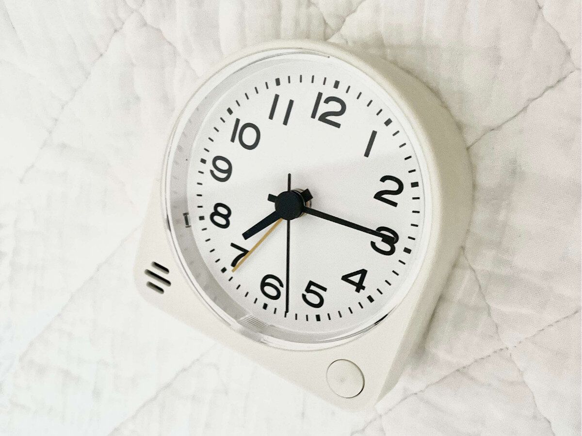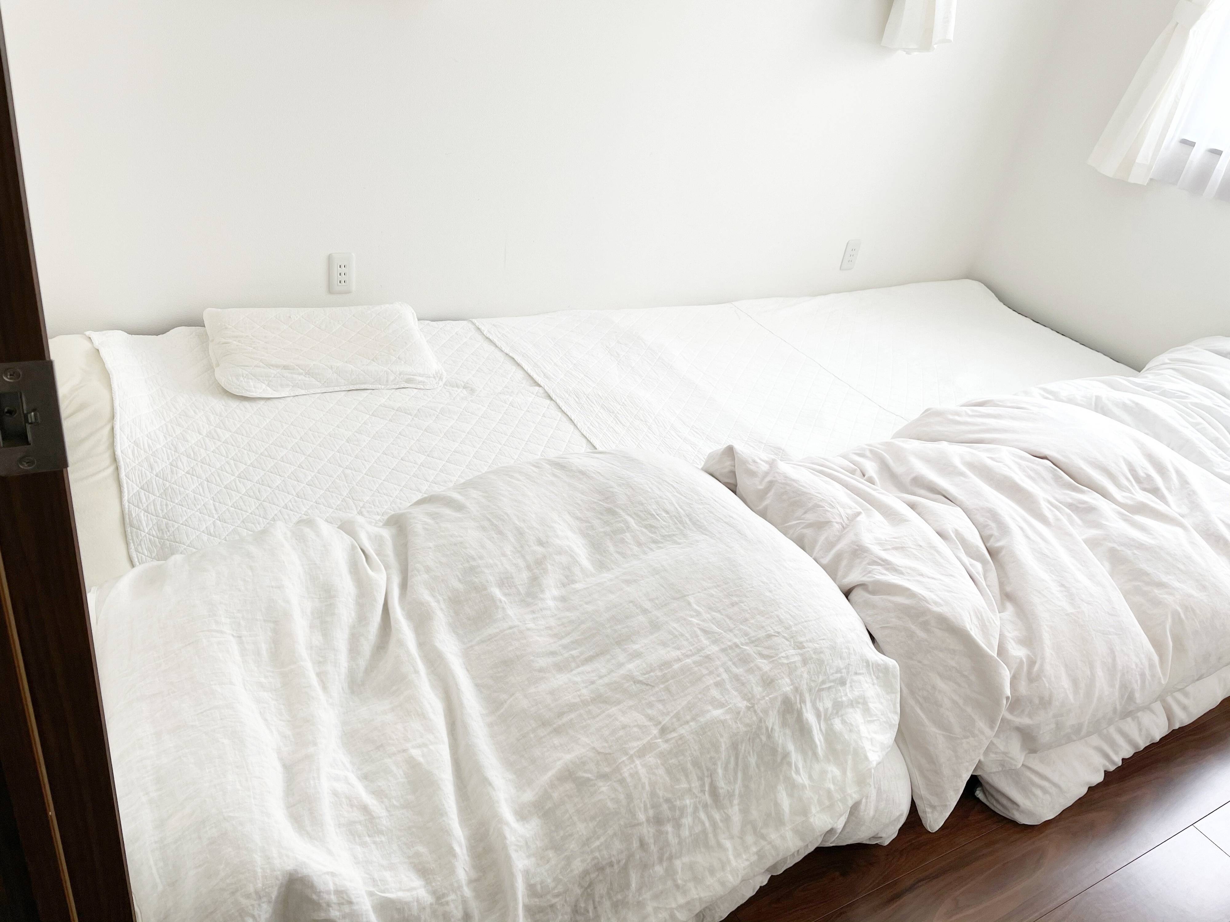 布団カバー・敷きパッド・枕カバーの寝具類をはじめ、カーテン、目覚まし時計などの小物まですべて白で統一しています。