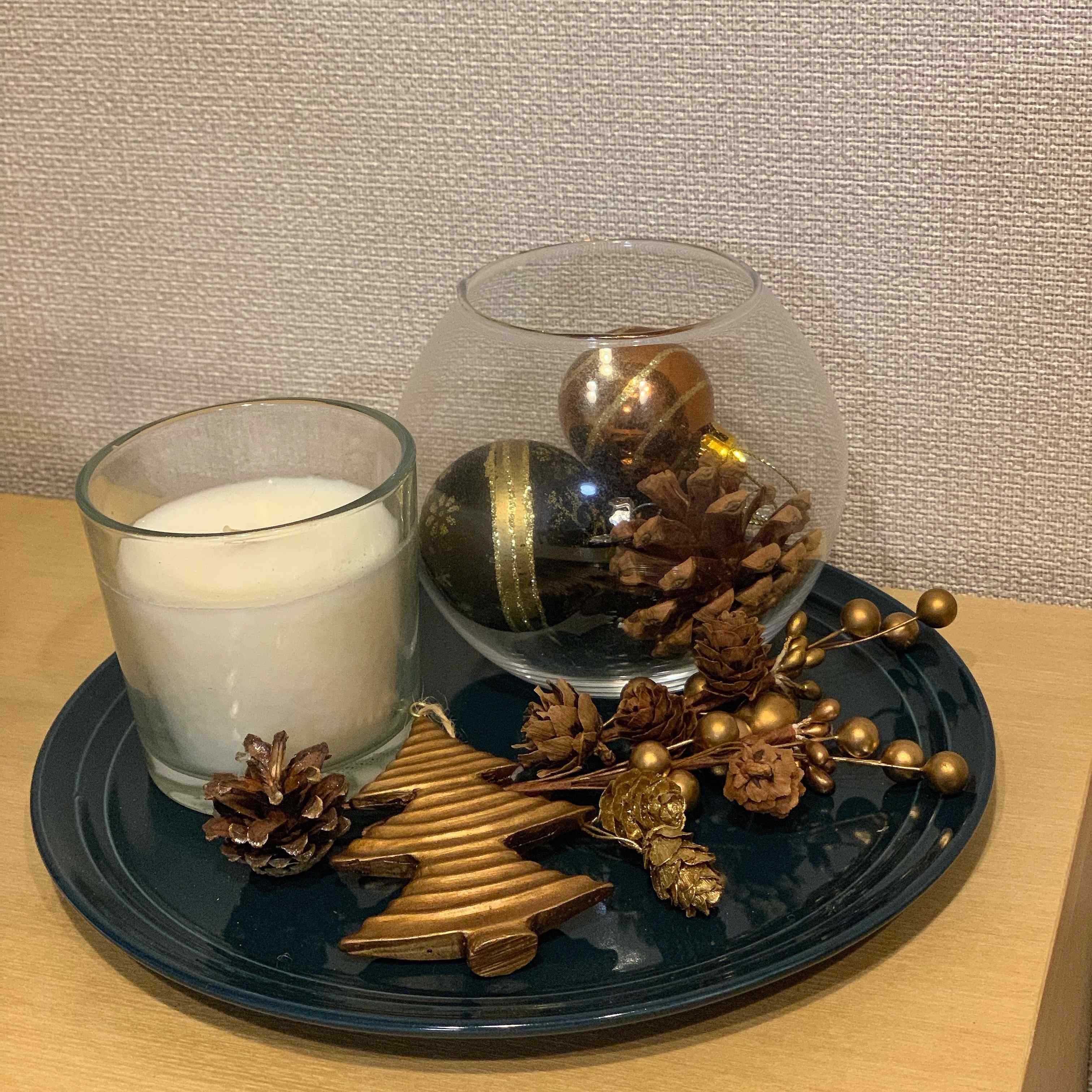 好きなオーナメントやキャンドルを一つのプレートにまとめて飾りつける「ワンプレートインテリア」この写真のプレートは、ナチュラルキッチンで購入したもの。上に載せている飾りも、100円ショップや雑貨屋さんなどで簡単に手に入るものばかりです。