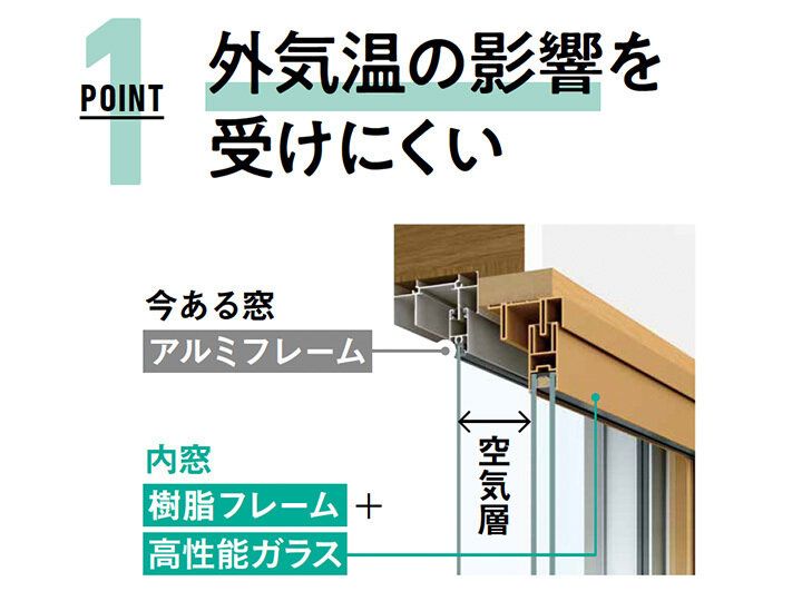 外窓と内窓の間にできる空気層と熱を伝えにくい樹脂フレームで外気温の影響を受けにくくなります。冷暖房効率も高まってお部屋が快適に!