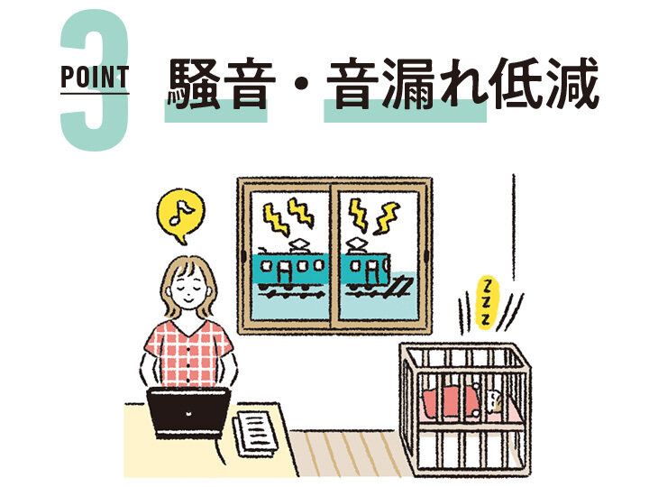 気密性の高い内窓を設置することで、遮音効果がアップ。騒音を大幅に減らすことができます。また、室内からの音漏れも防げます。