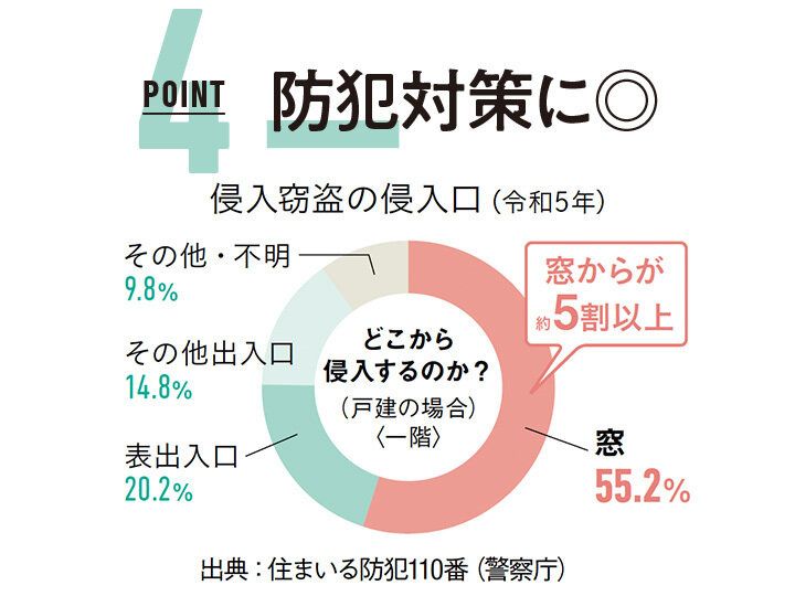 二重窓にすることで、泥棒に視覚的に侵入をためらわせたり、破壊を手間取らせて侵入をあきらめさせる効果も。だから防犯対策にも◎