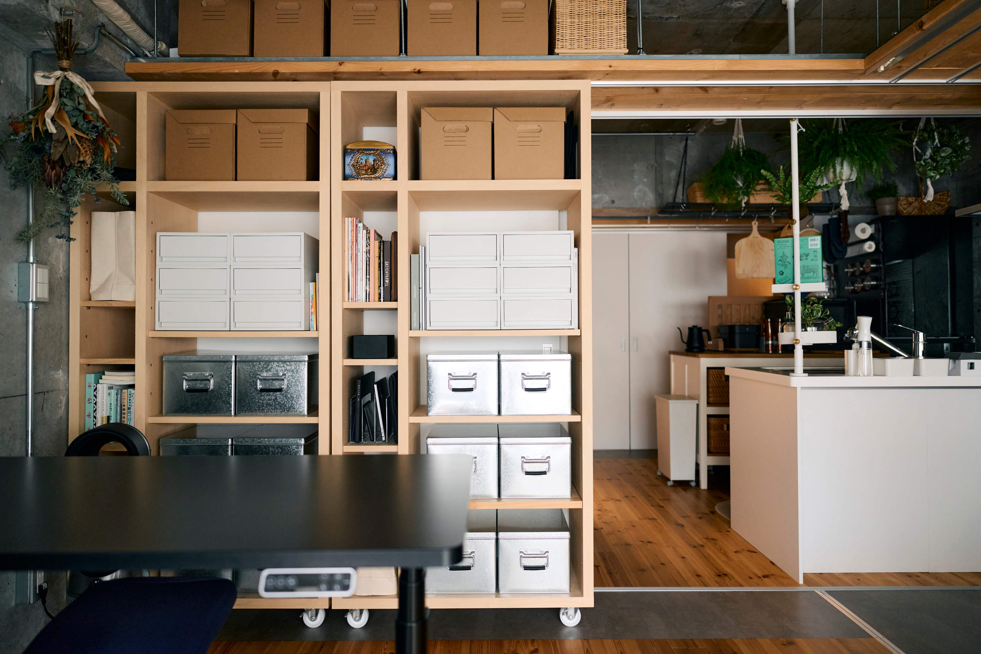 無印良品のポリプロピレンケースやトタンボックスを愛用。使い勝手がよく、並べると美しい。整然と並んだ棚は、家の中の好きな場所のひとつ。