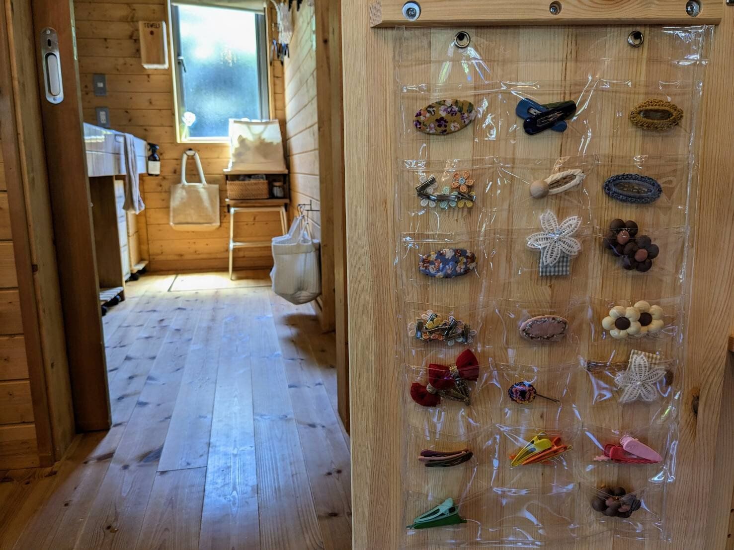 私のアクセサリー収納場所は、洗面所にあるミラーキャビネットの扉裏!娘たちのヘアアクセ同様に、セリアの「ウォールポケット」を使って収納しています。