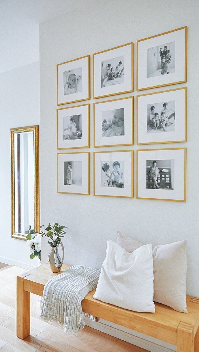 フレームをずらり並べた壁はザ・海外インテリアのおしゃれさ。「フレームはイケア。家族写真でも、モノクロでプリントすると雰囲気が出ます」。