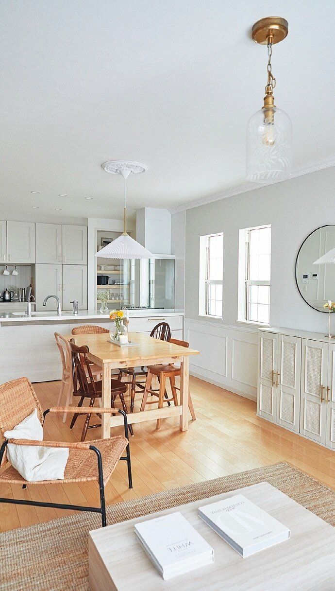 腰壁、キッチンの扉、ペンダントライトの上の飾り(メダリオン)など、クオリティが高すぎて、どこがDIYなのか判別が難しいほど!