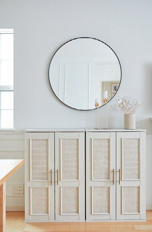 キャビネットはニトリの物で、元はガラス戸。ラタンシートやモールディングを貼って全体をペイントしました。お気に入りの円形の大きな鏡はイケア。
