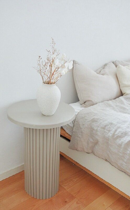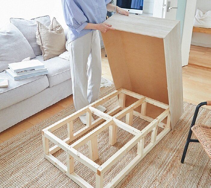 ホームセンターで見つけた、風呂のふたのような形状の波形クッションを、100円ショップのごみ箱に巻いてテーブルの脚に。材料を探すのも楽しい。