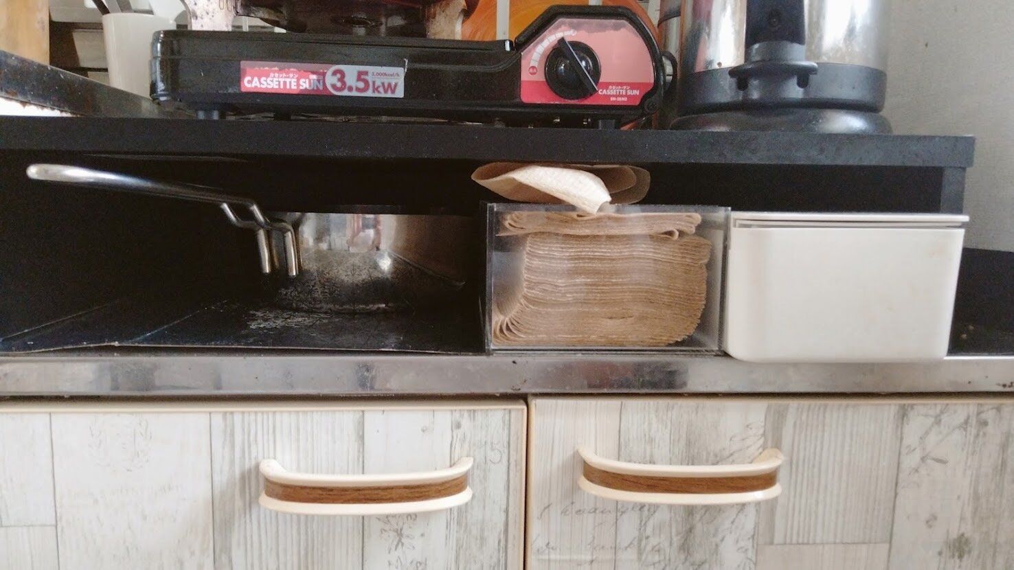 掃除しやすいように、掃除シートはコンロ下が定位置。