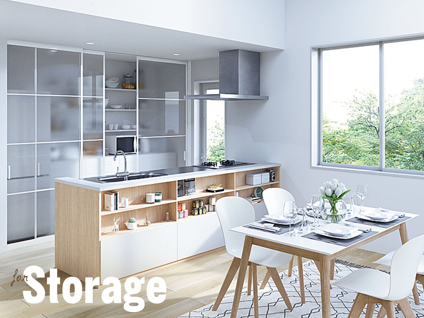 散らかりがちなキッチンに採用すれば、奥行き感を出しながらも物が丸見えにはならず、洗練された印象に!