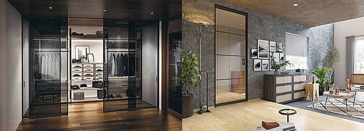 左)フレームもガラスもブラックで統一。こだわりのクローゼットをシックに演出するスモークカラー