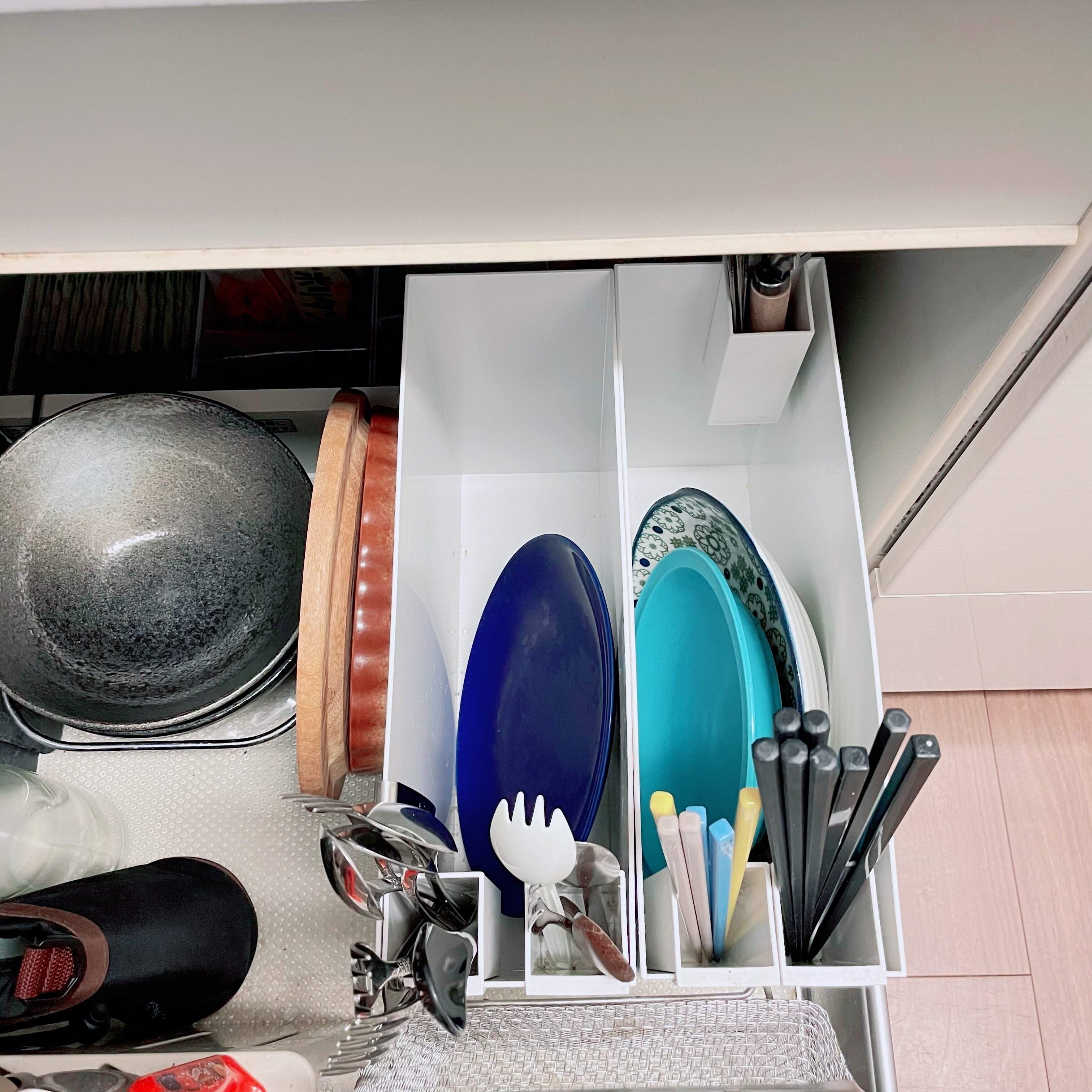 例えば、ファイルボックスの左は小皿、右は大皿を収納し、ペンポケットにそれぞれカトラリーを種類別に収納すると、迷子になりません。