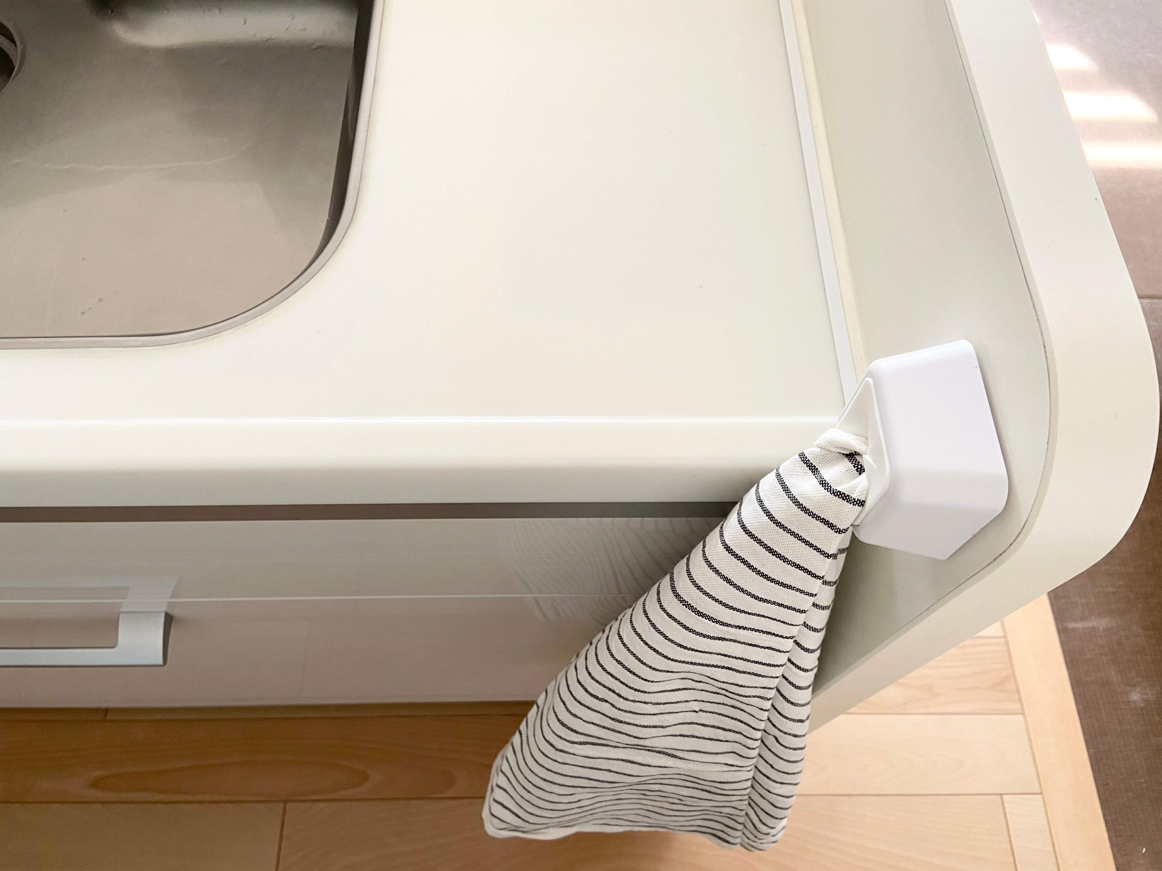キッチンタオルの収納にセリアのタオルホルダーを使っていたのですが、引き出しに設置すると設置場所が低くて屈まないといけないのがプチストレスに。そこでタオルホルダーのフック部分を取り外して、腰を屈める必要のない場所に魔法のテープを使ってタオルホルダーを設置。