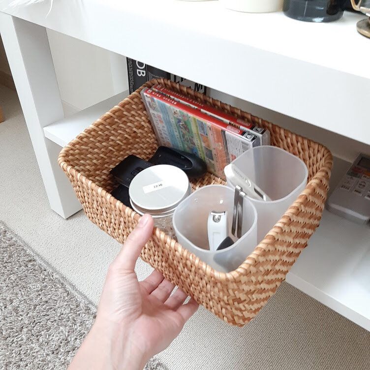 さらに1日に何回も使用するものは、リビングに座っている状態ですぐに手の届く場所に置いています。リモコン、ティッシュ、ゲーム、爪切り、綿棒は家族も私もよく使うのでかごにざっくりと入れて取り出しやすくもどしやすい収納にしています。