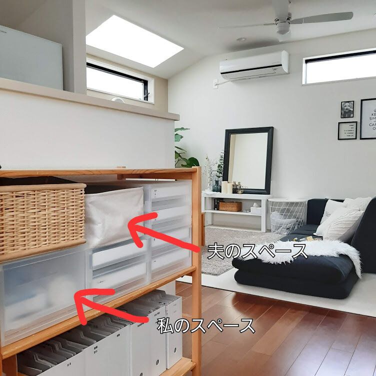 夫と私のものはワークスペース周辺に。入っていればOKというゆるいルールでノンストレス。