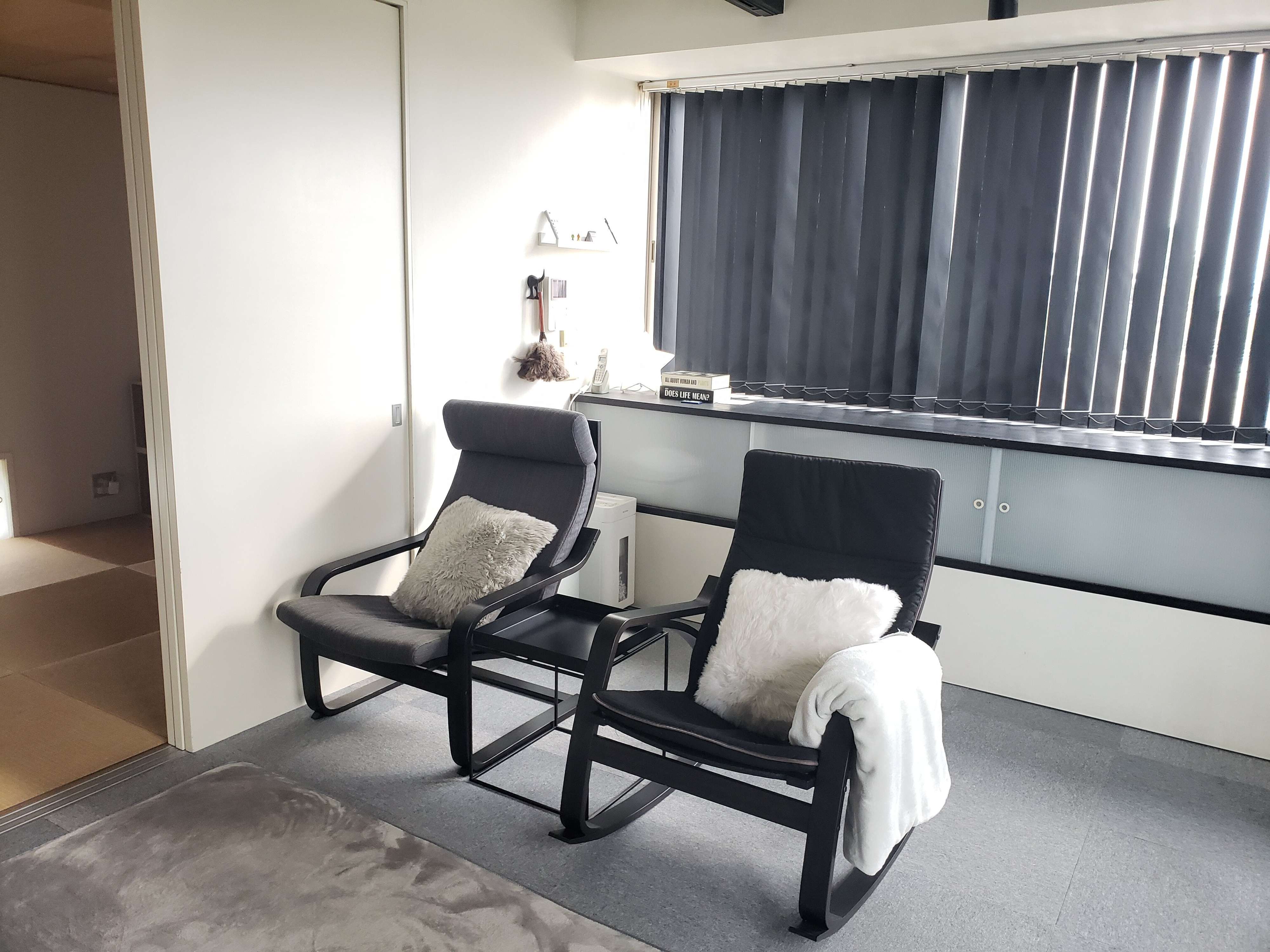 こたつと大きなソファーをなくし、不要になっても解体できる1人がけのソファーを2脚、無印良品の体にフィットするソファー1つ、楽天で購入した人と暮らしになじむクッション2つ。