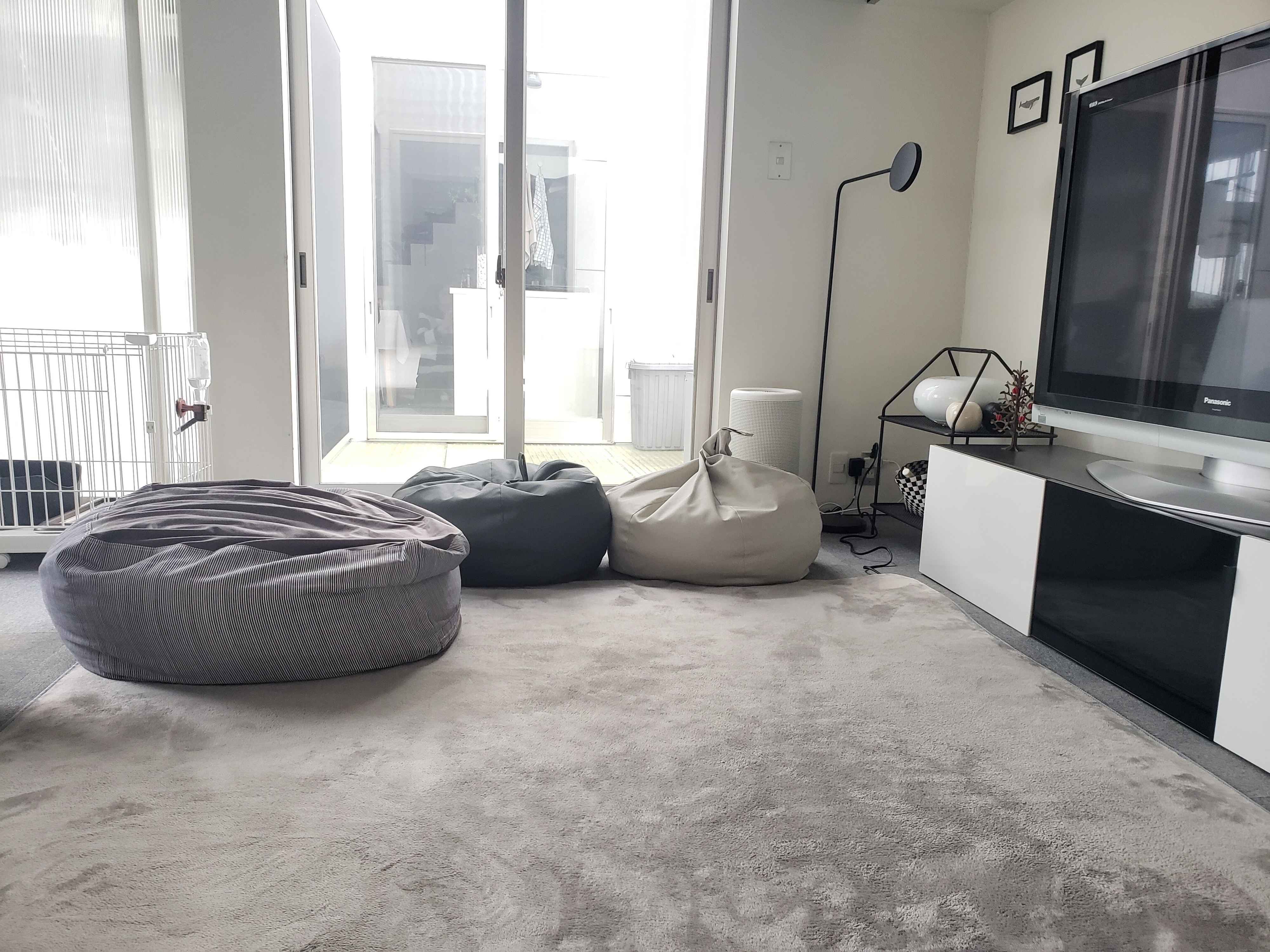 4人家族+愛犬の5人分、1人1つずつくつろぐ場所をコンパクトにつくることができました!これだけ置いてもごちゃつきは感じられません。それは、やっぱりテーブルがないから。