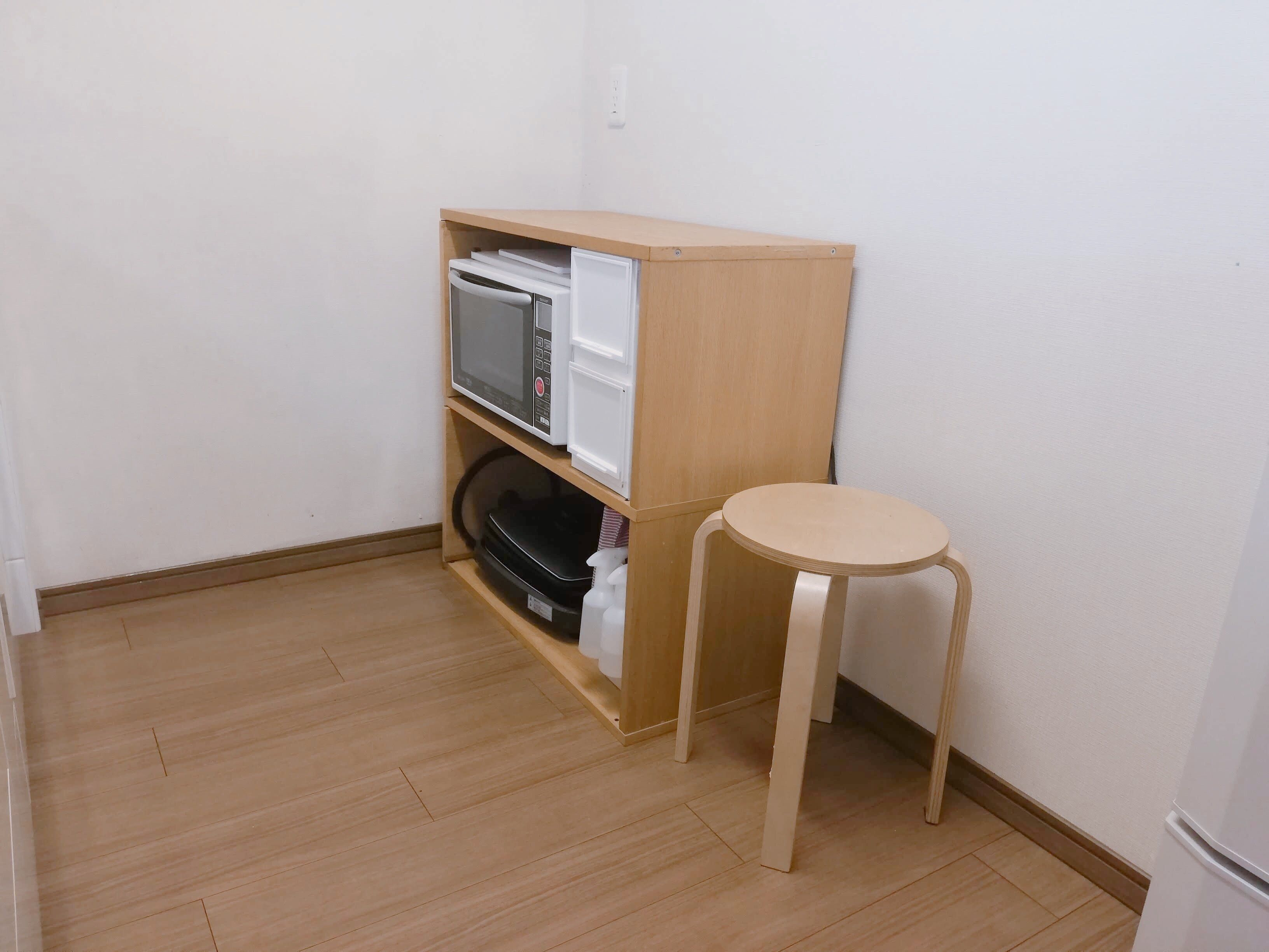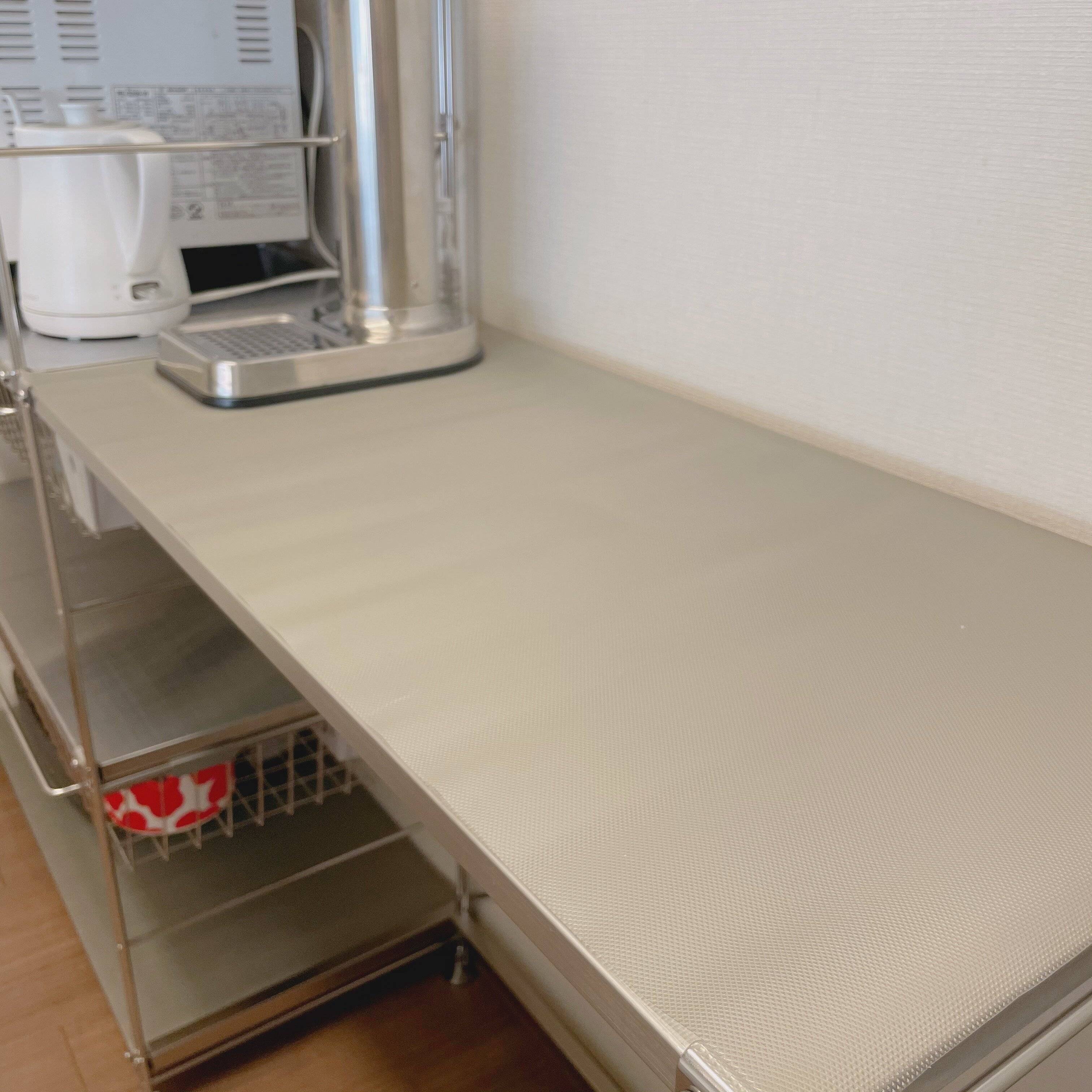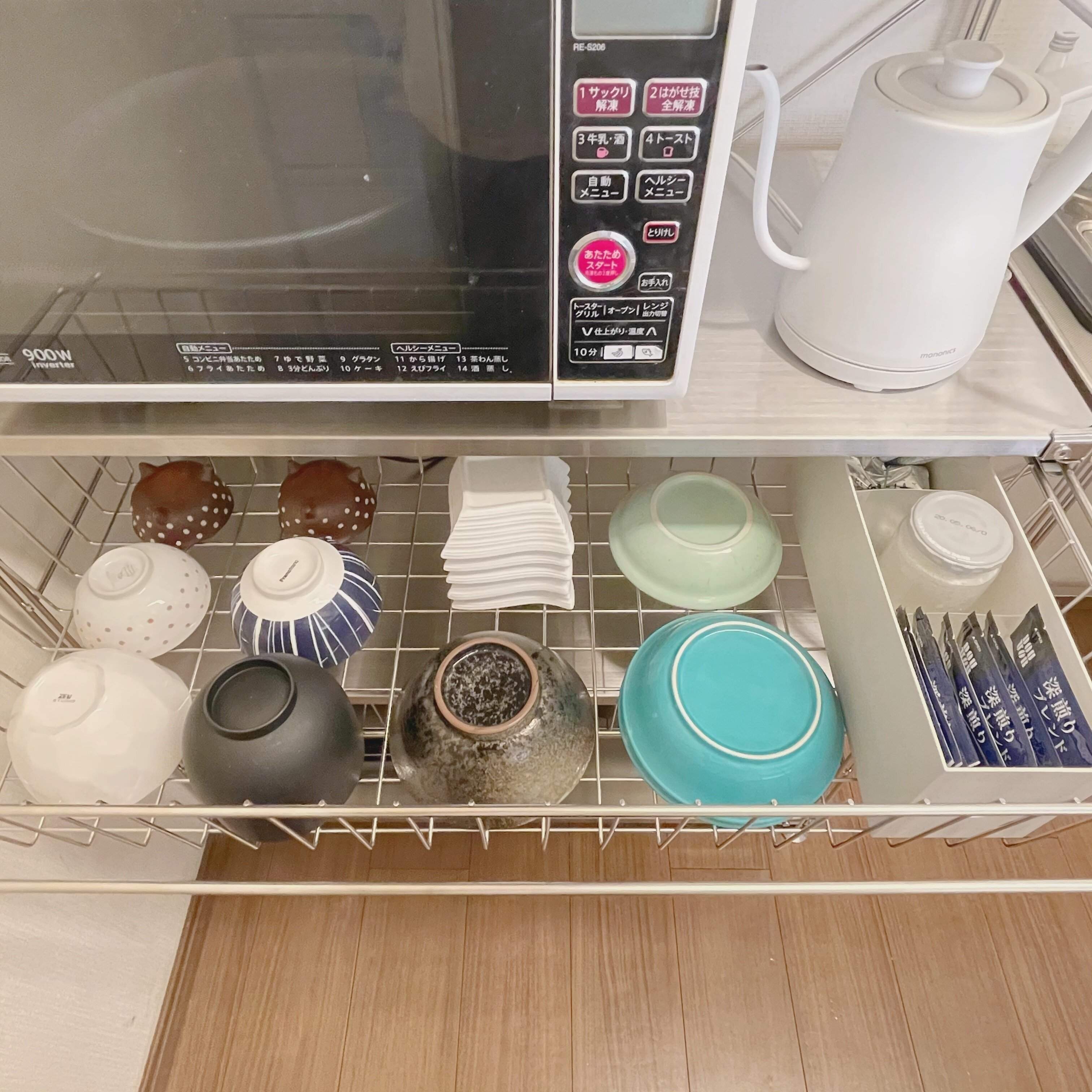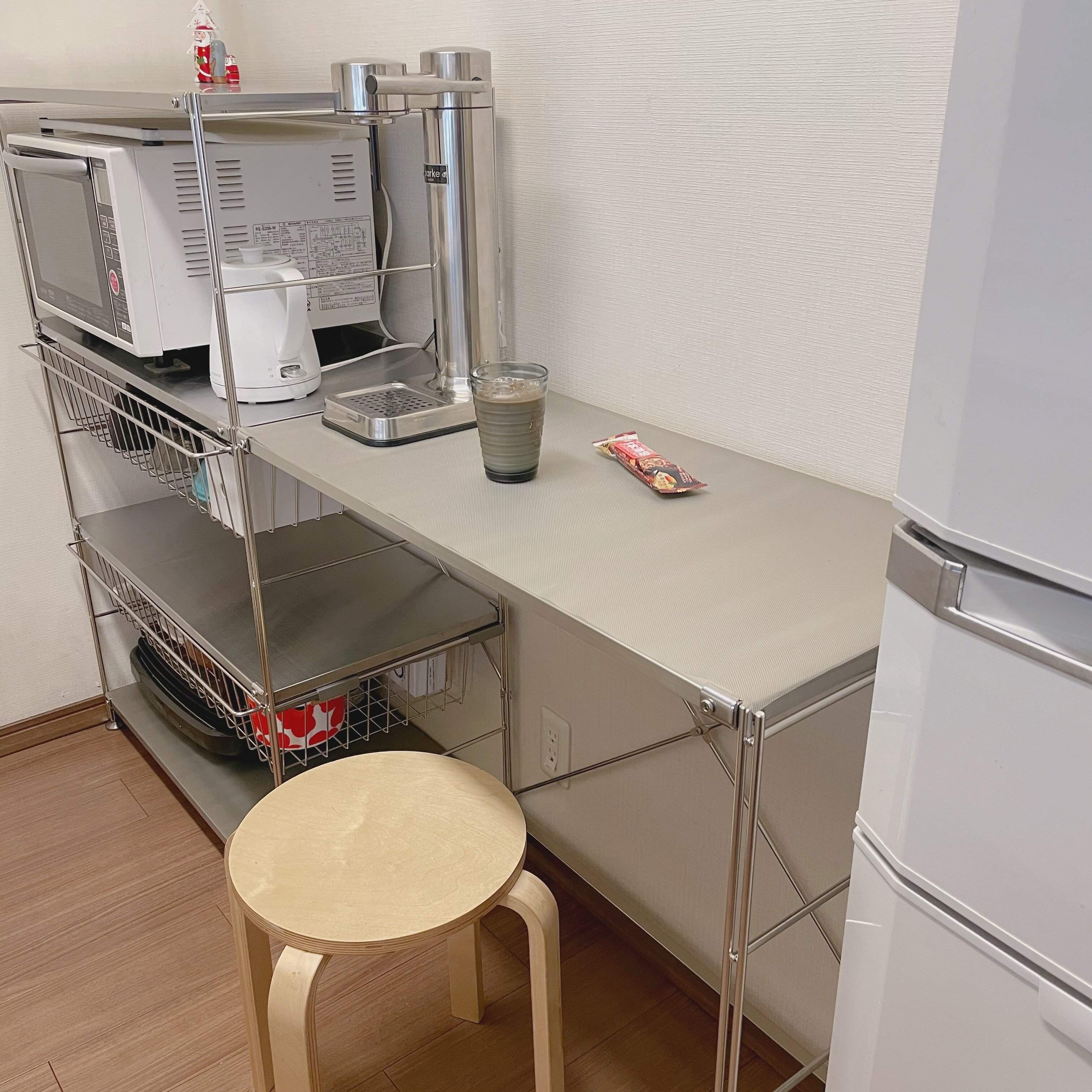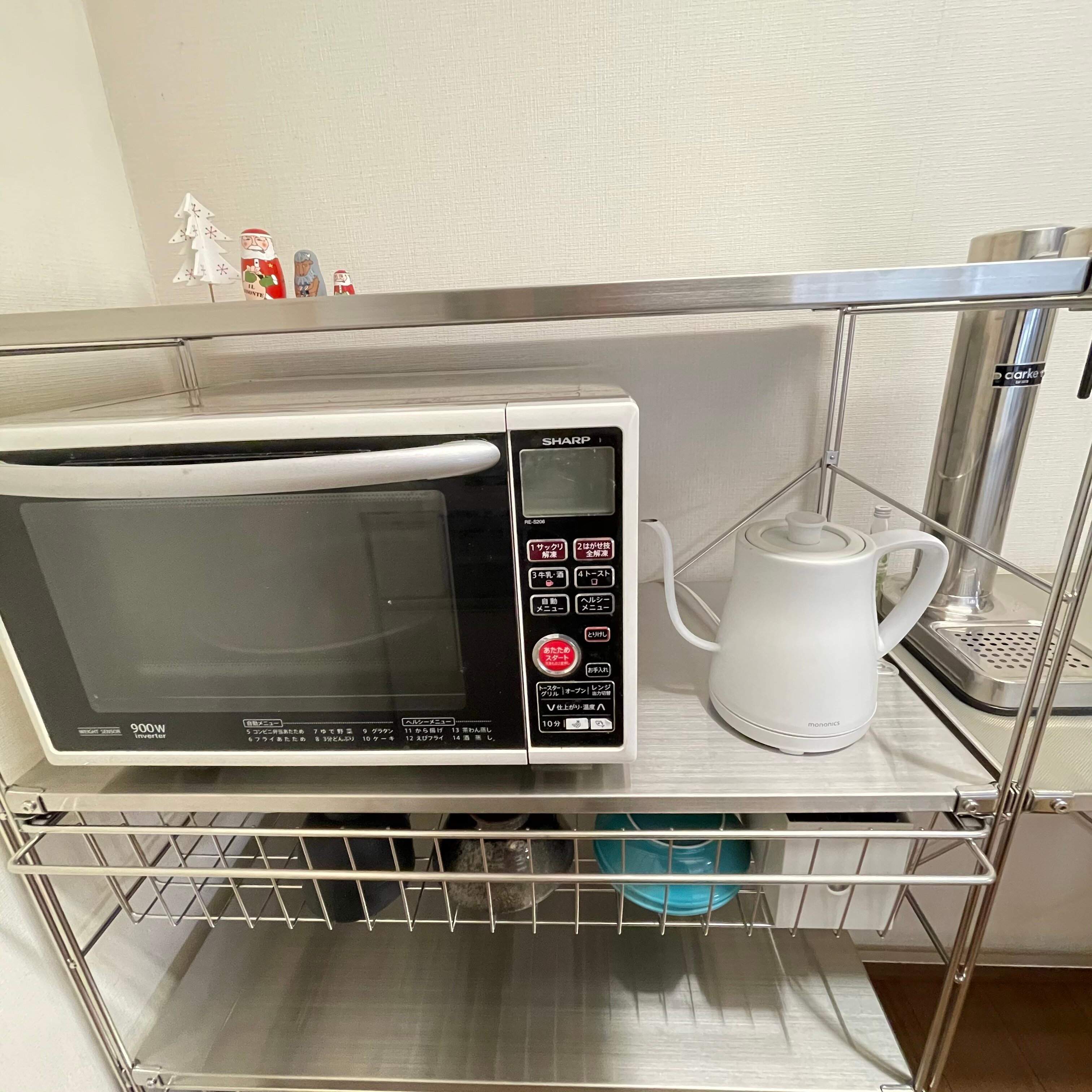 電子レンジとケトルは、子どもが使う場面はほとんどないので、大人が使いやすい1番上の棚にまとめました。