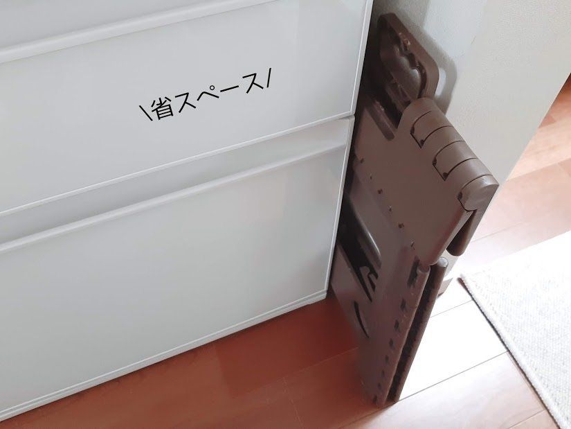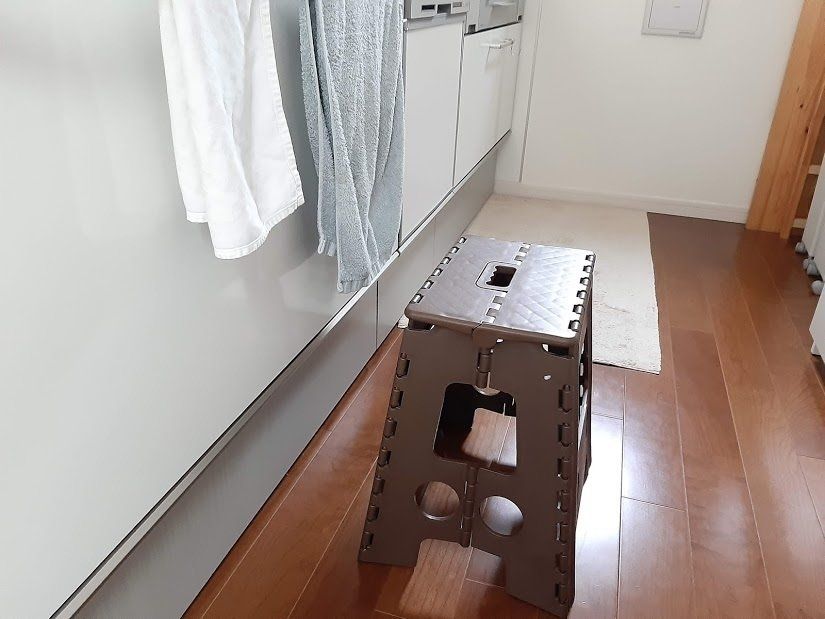 背の小さい次女のために近くに踏み台を置いて自分で持ってきてもらいます。折りたたみ式だと省スペースで収納しておくことができます。