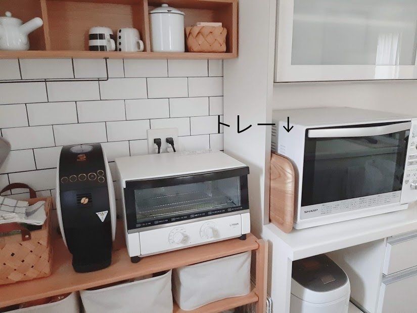 さらにその横のすぐ取れる位置にトレーを置いています。子どもはそのトレーに乗せてテーブルまで運びます。あまり大きいと子どもが持ちにくいので少し小さめが使いやすいです。