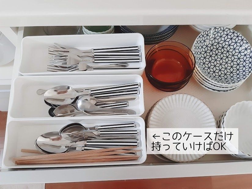 お箸はこのケースのままテーブルへ。以前はアイテムごとに収納していましたが、同じタイミングで使うものはいっしょに収納しておくことで、いちいち考えて取り出さなくてすみます。スプーンやフォークなどもいっしょに収納しておけば、持っていくだけなので簡単。子どもにも頼みやすいですし、食事中に取りにいくこともなくなります。